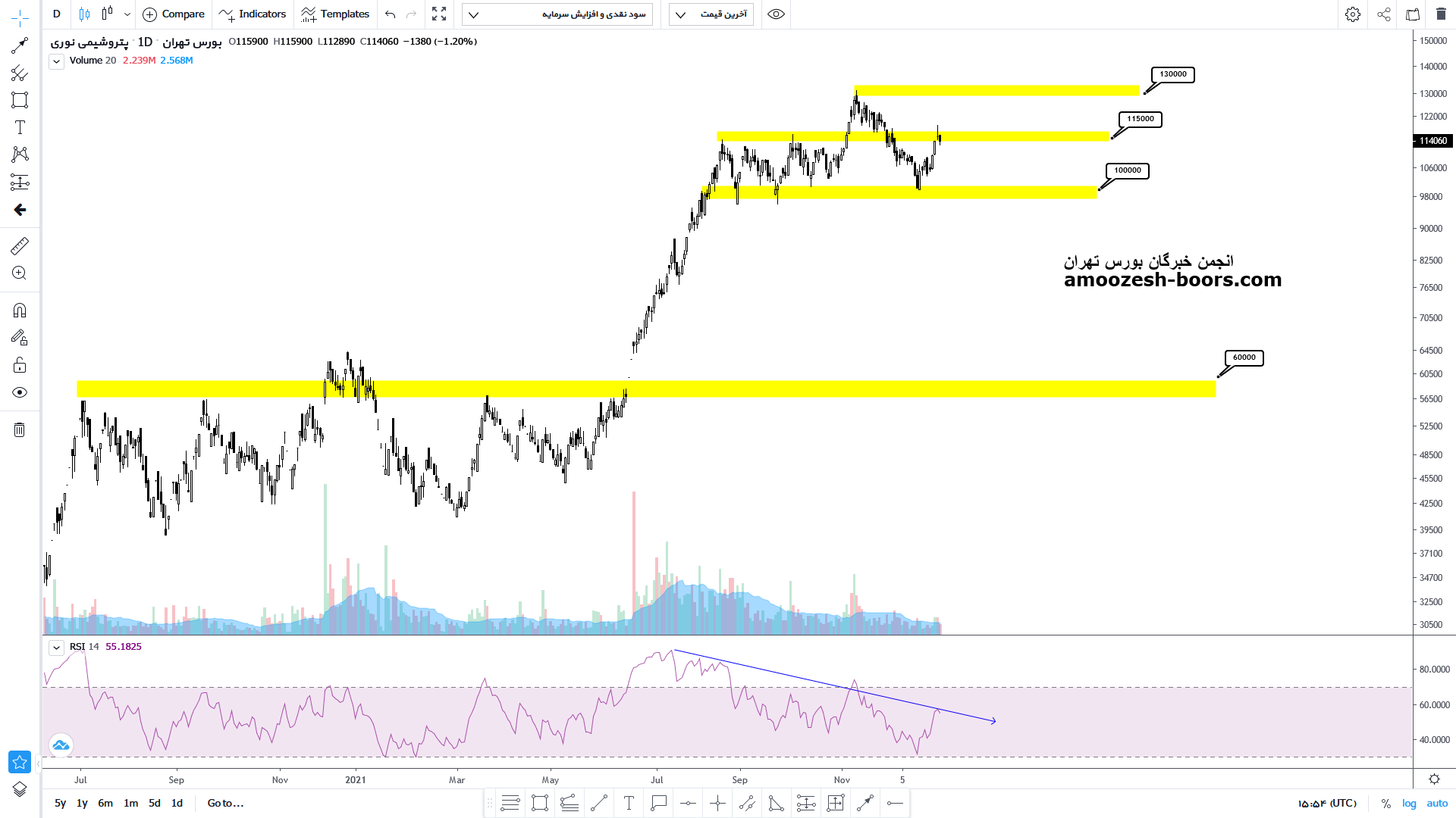 با توجه به مشاهده واگرایی نزولی در سقف قیمتی پس از رشد 150 درصدی از مرداد 99 تا به الان انتظار اصلاح بیشتری از سهم داریم.