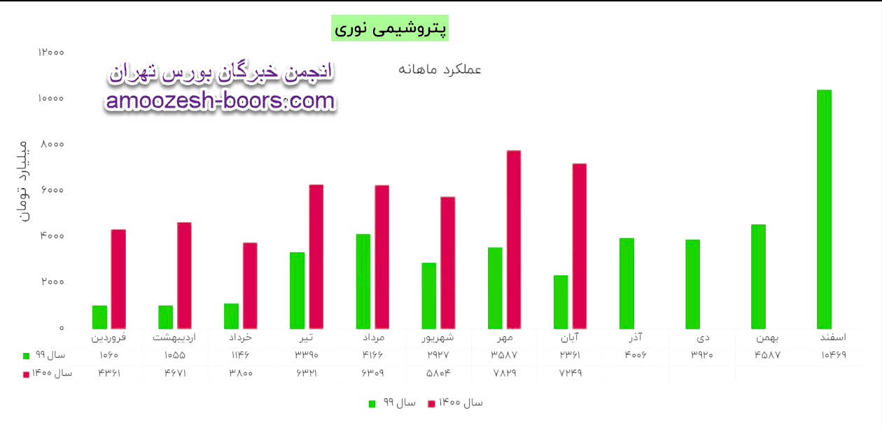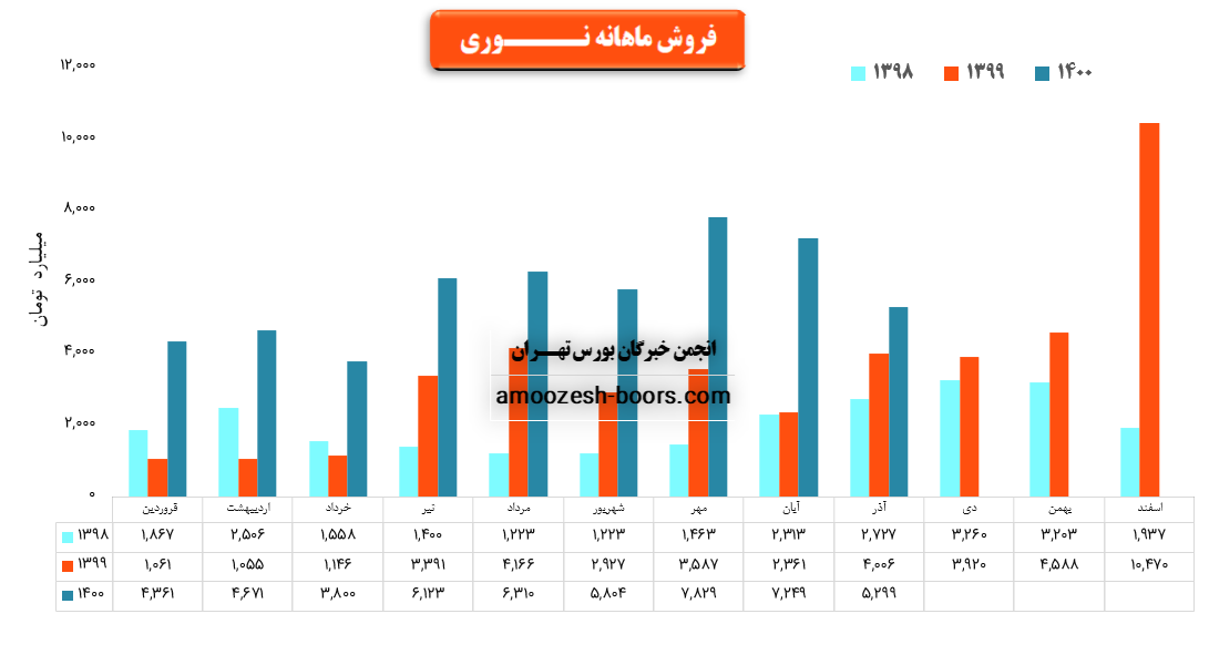 نماد نوری در آذر 1400 مبلغ 5299 میلیارد تومان درامد داشته که این میزان نسبت به ماه گذشته 27% افت و همچنین نسبت به مدت مشابه سال گذشته 32% رشد پیدا کرده است!