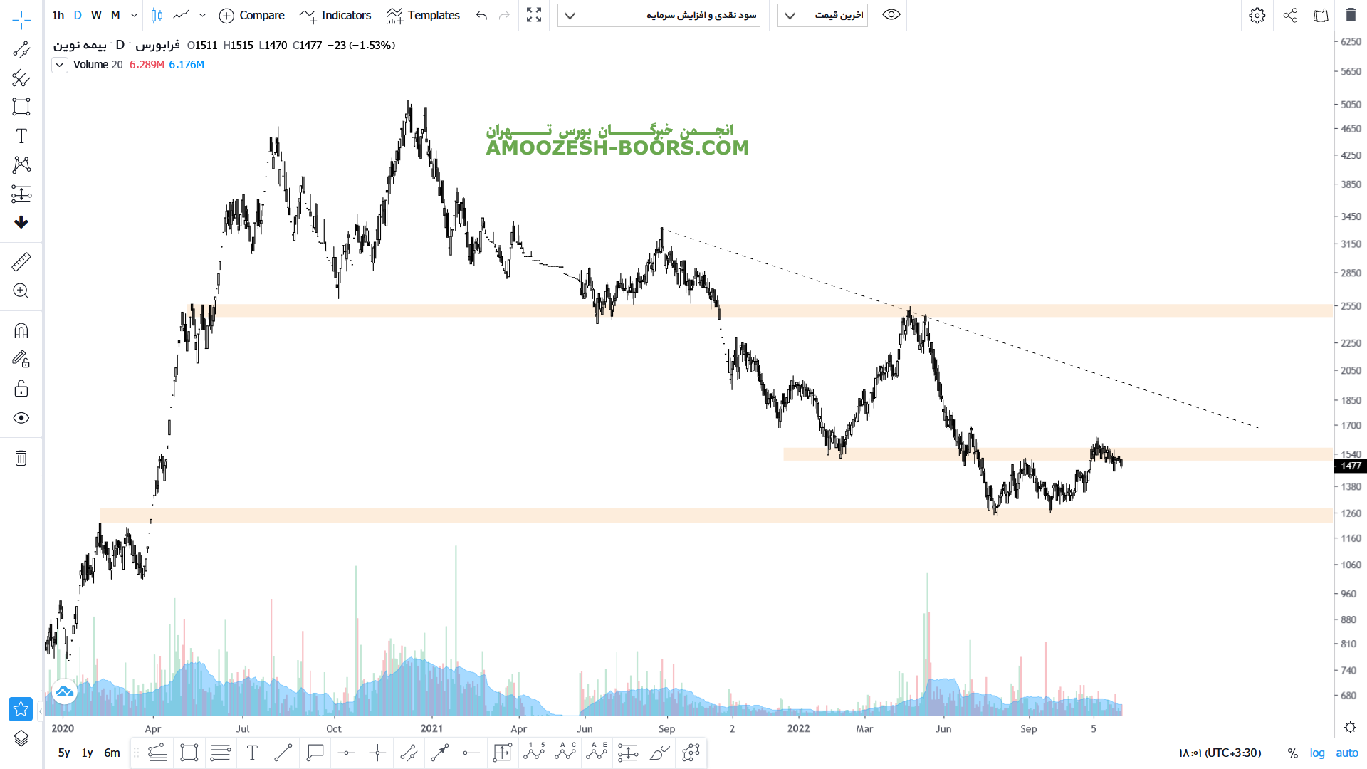 قیمت نماد نوین (شرکت بیمه نوین) پس از ایجاد الگوی دبل باتم در حال شکست خط گردن خخود برای رشد بیشتر میباشد اما درصورت از دست ررفتن ناحیه حمایت 150 تومان قیمت میتواند مجددا تا ناحیه کف 120 تومان نیز اصلاح خود را ادامه دهد. درصورت حفظ این ناحیه حمایتی مقاومت های مهم خخط روند نزولی پیش روی قیمت وجود دارد.