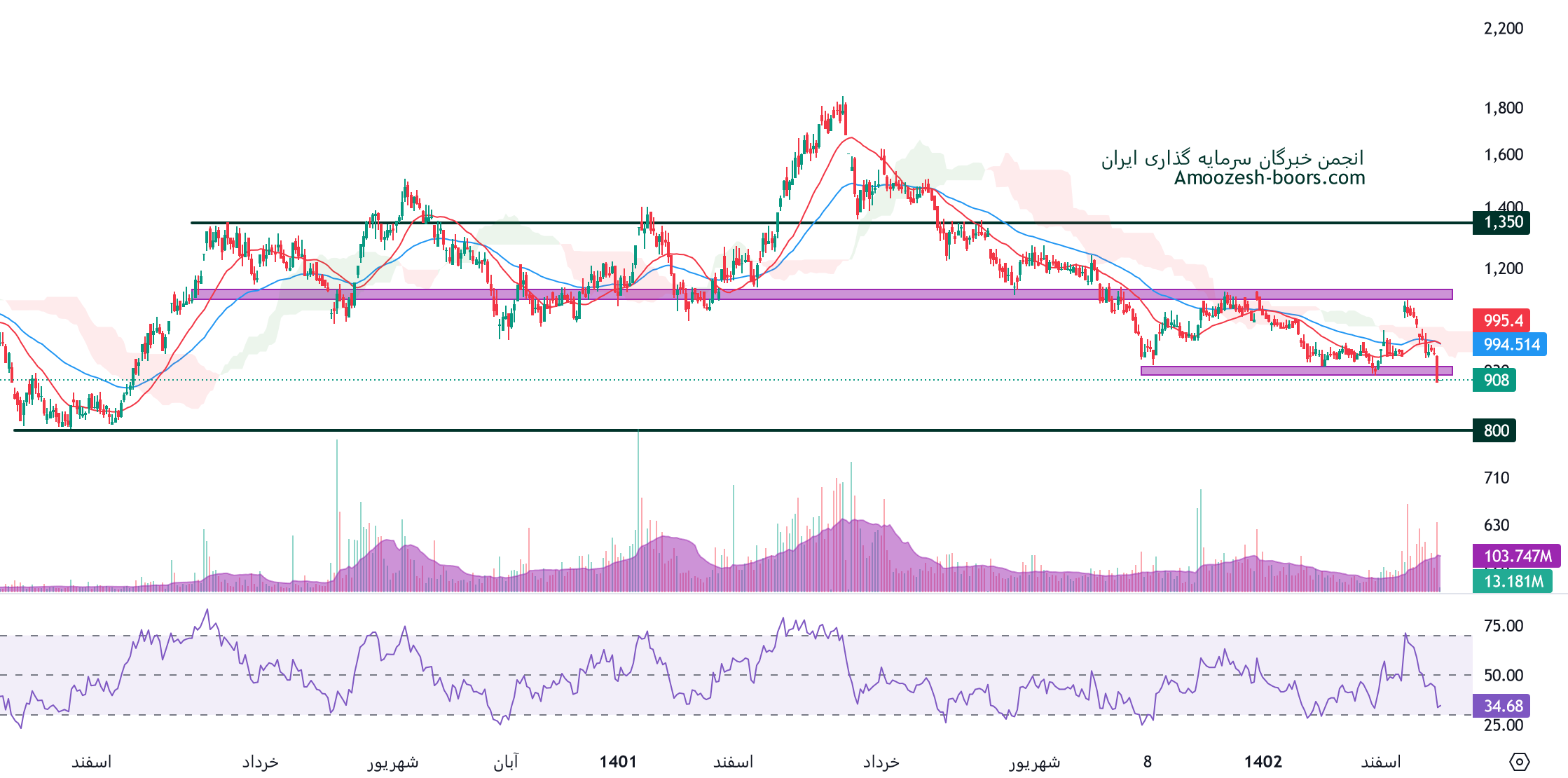 در صورت متعادل شدن جو بازار قیمت پتانسیل برگشت داشته که در این صورت مقاومت های های وب به ترتیب 1150 و 1350 ریال در نظر گرفته خواهند شد.