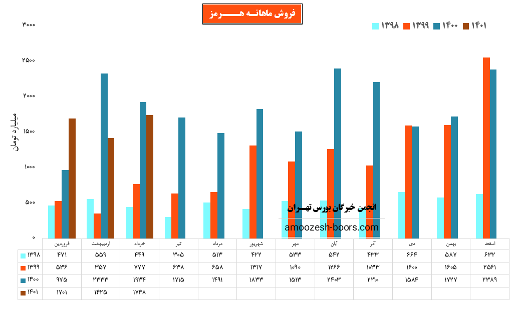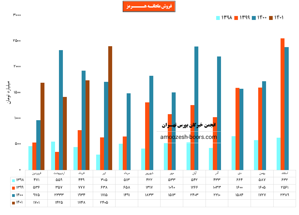 نماد هرمز (شرکت فولاد هرمزگان جنوب) در تیر ماه سال ۱۴۰۱ حدود مبلغ 2405 میلیارد تومان درآمد داشته که این میزان در برابر ماه گذشته 38% و همچنین در مقایسه با مدت مشابه سال گذشته 40% رشد پیدا کرده است.
