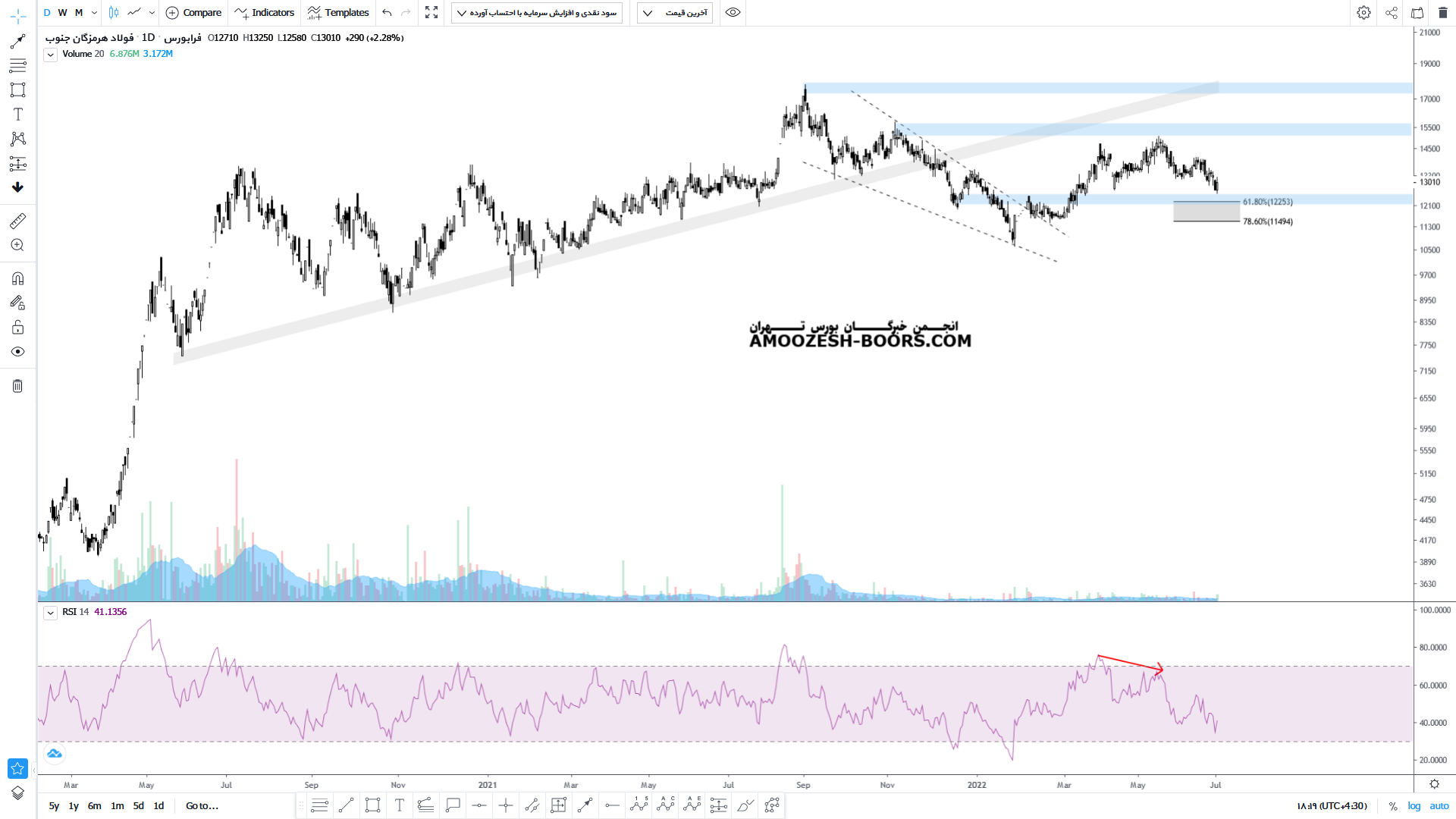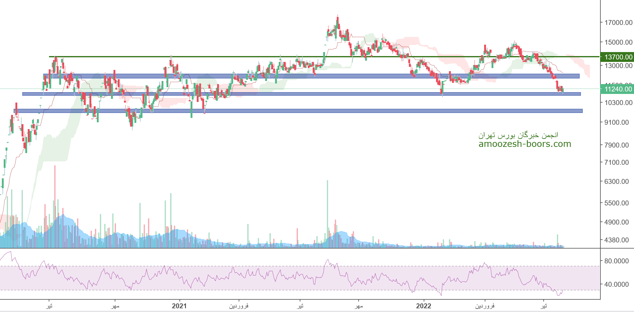 قیمت پس از برخورد به ناحیه مقاومتی مهم محدوده ۱۵۰۰ تومان و با نشان دادن واگرایی منفی و بروز واکنش منفی نسبت به این محدوده مقاومتی وارد فاز اصلاحی شده است که اکنون محدوده حمایتی ۱۲۰۰ تومان را پیش روی خود دارد که در صورت حمایت می تواند مجددا مقاومت ۱۵۰۰ تومان رشد کند اما در صورت عدم حمایت در این محدوده قیمت میتواند تا کف حمایتی محدوده 1000 تومان نیز اصلاح خود را ادامه دهد.