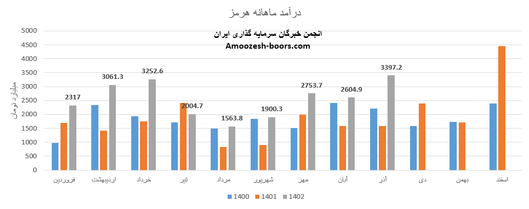 فروش آذر ماه سال 1402 سهم هرمز 3397.2 میلیارد تومان گزارش شده است که 60% از این رقم از طریق فروش داخلی و مابقی از طریق صادرات تامین گردیده است، تغییرات درآمدی هرمز به شرح زیر میباشد: