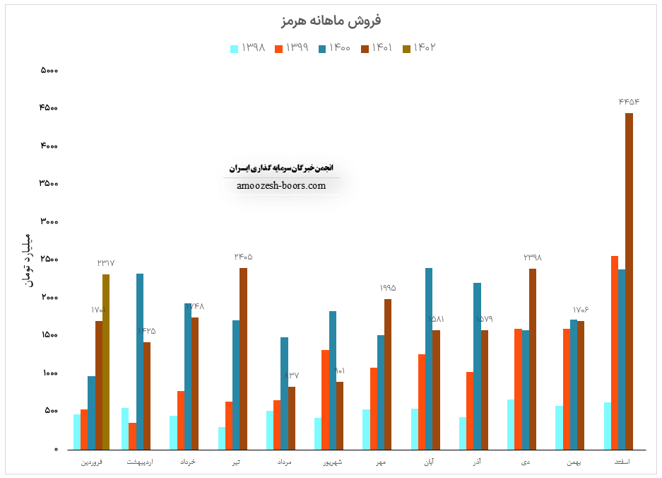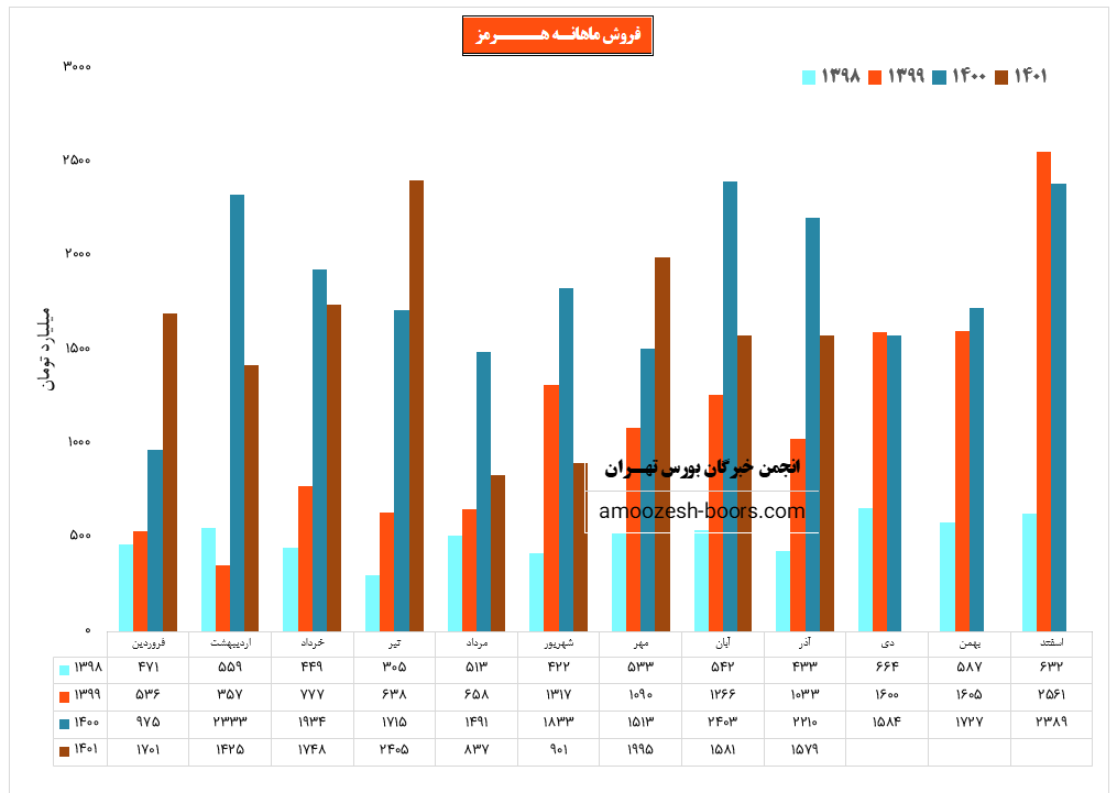 نماد هرمز در عملکرد ماهانه اردیبهشت ماه به فروش 3061.3 میلیارد تومانی دست یافته است، این رقم در مقایسه با ماه گذشته 32% و نسبت به مدت مشابه 115% افزایش را نشان میدهد، میزان فروش اسلب صادراتی که در مقایسه با ماه گذشته کاهش نرخ 12 درصدی داشته، در مقدار فروش رشد 208 درصدی را تجربه نموده است، عملکرد دو ماهه سهم هرمز در مقایسه با مدت مشابه 72% افزایش داشته و 14% از کل درآمد سال گذشته را پوشش داده است، سهم هرمز 63% از درآمد خود را از محل فروش صادراتی تامین نموده است.