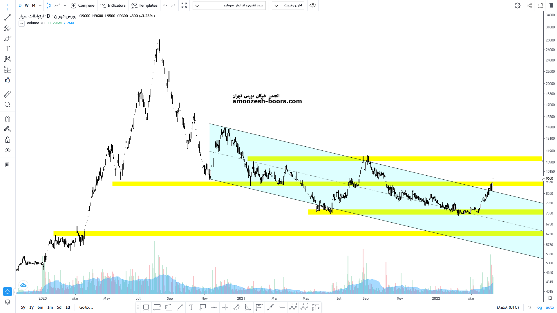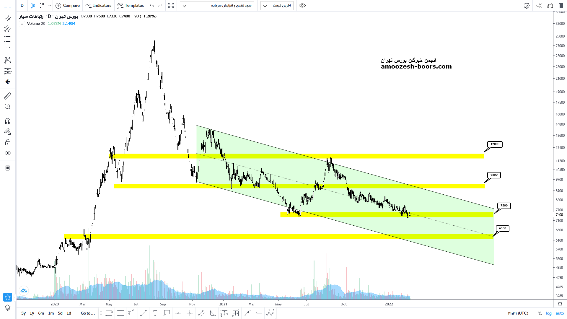 نماد همراه پس از برخورد به مقاومت ۱۱۰۰ تومان با ۳۵ % اصلاح اکنون به محدوده حمایتی ۷۵۰ تومان رسیده است در صورت حمایت از این محدوده حمایتی میتواند رشدی را تا محدوده مقاومتی سقف کانال یعنی محدوده ۹۵۰ تومان و در صورت شکست رشد را تا محدوده مقاومتی۱۱۰۰ تومان ادامه دهد اما در صورت عدم حمایت و تمایل قیمت به اصلاح بیشتر محدوده ی بعدی که می تواند در سهم تقاضا به وجود بیاورد محدوده حمایتی ۶۳۰ تومان می باشد