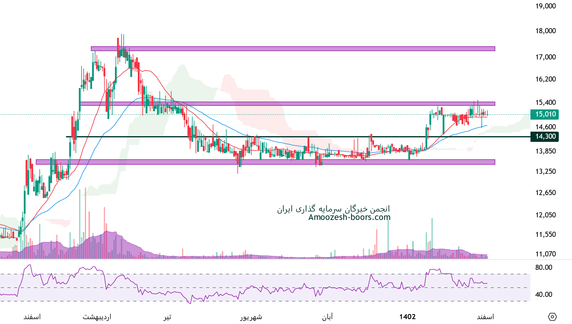 همانطور که در تحلیل تکنیکال وامید میبینیم قیمت در محدوده حمایتی 14300 ریال و محدوده مقاومتی 15400 ریال در حال نوسان میباشد.