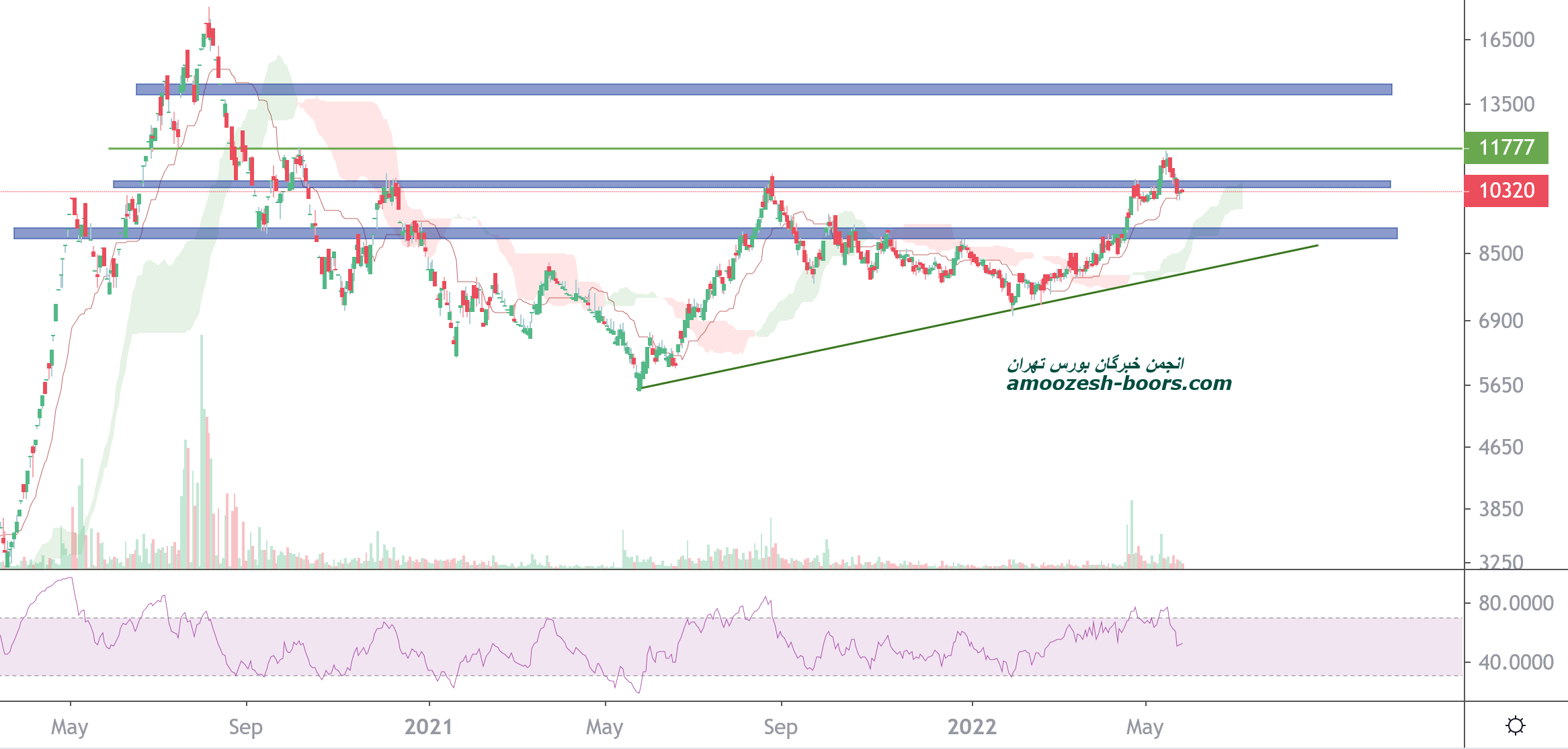 قیمت در حال حاضر درگیر محدوده حمایتی استاتیک روی عدد رند و روانی 10000 ریال میباشد،در صورت تثبیت قیمت در این منطقه تارگت های سهم 11500 و 14000 ریال در نظر گرفته خواهد شد و همچنین در صورت از دست رفتن این حمایت،حمایت بعدی 9000 ریال در نظر کرفته خواهد شد.پ