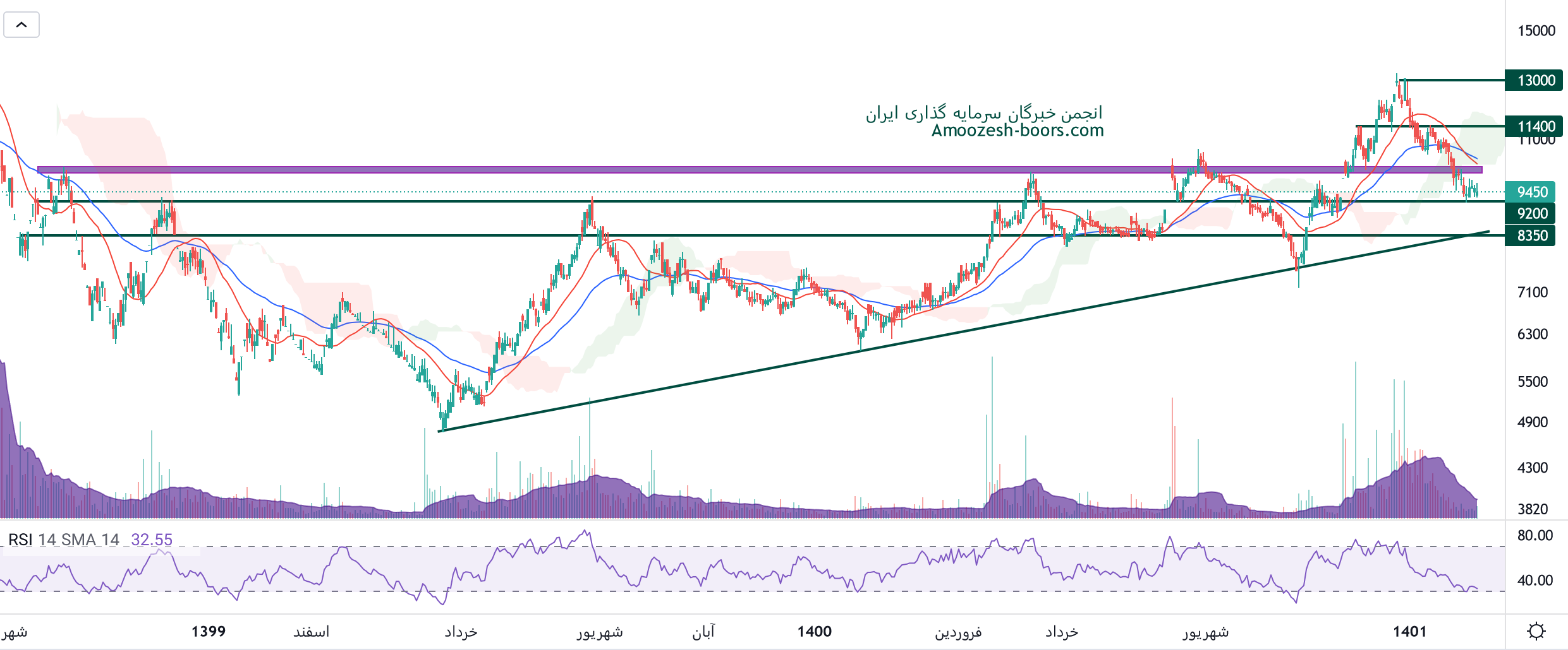 نماد وبانک حمایت 9200 ریال را دارا میباشد، در صورت تثبیت قیمت در این محدوده قمیتی، حرکت سهم تا 10200 و 11400 ریال محتمل خواهد بود، همچنین در صورت از دست رفتن این محدوده حمایتی، حمایت بعدی محدوده 8350 ریال در نظر گرفته خواهد شد.