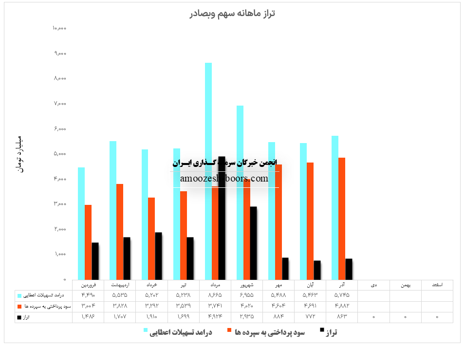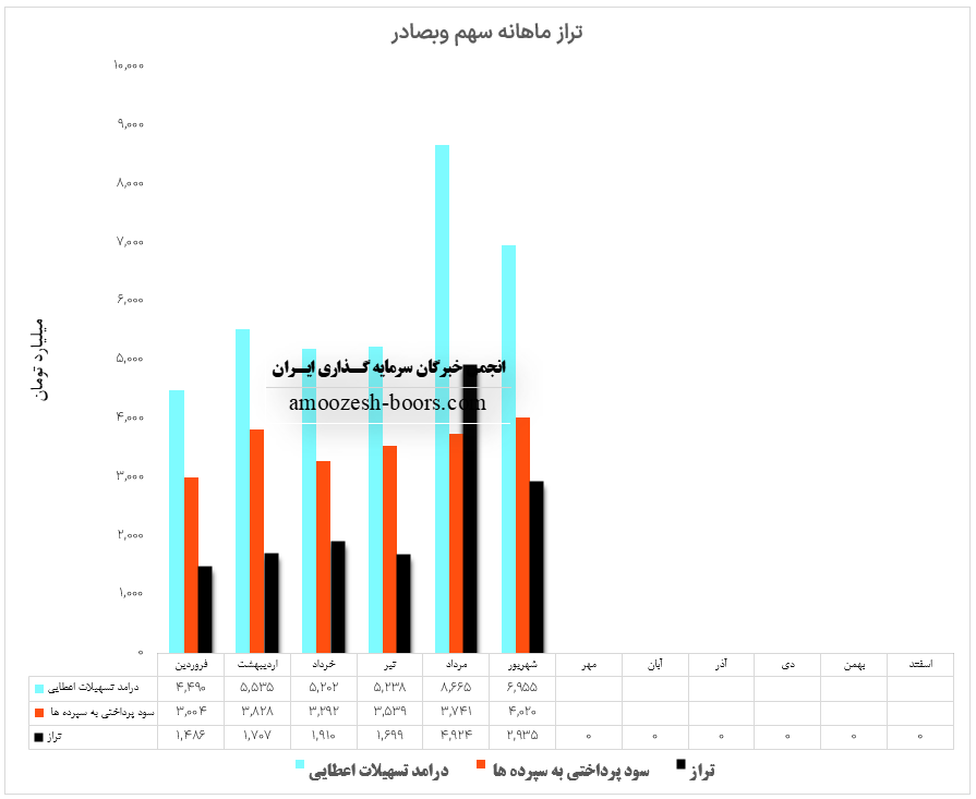 سهم وبصادر (شرکت بانک صادرات) در آذر ماه سال 1402 حدود مبلغ 5745 میلیارد تومان درآمد داشته که این میزان در مقایسه با ماه گذشته 5% افزایش پیدا کرده است. همچنین نماد وبصادر در آذر ماه مبلغ 4882 میلیارد تومان به سپردههای خود سود پرداخت کرده که این میزان با افزایش 4 درصدی نسبت به ماه گذشته روبرو شده و لذا با توجه به آمار مذکور تراز وبصادر با 12 درصد افزایش به مثبت 863 میلیارد تومان رسیده است.