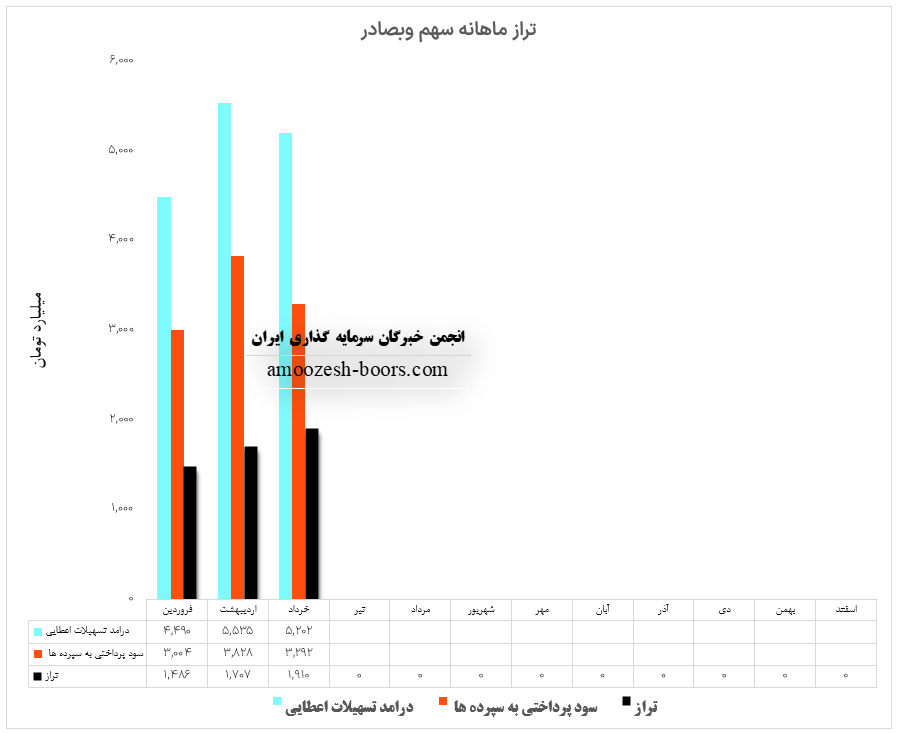 سهم وبصادر (شرکت بانک صادرات) در خرداد ماه سال 1402 حدود مبلغ 5202 میلیارد تومان درآمد داشته که این میزان در مقایسه با ماه گذشته 6% کاهش پیدا کرده است. همچنین نماد وبصادر در خرداد ماه مبلغ 3292 میلیارد تومان به سپردههای خود سود پرداخت کرده که این میزان با کاهش 14 درصدی نسبت به ماه گذشته روبرو شده و لذا با توجه به آمار مذکور تراز وبصادر با 12 درصد افزایش به 1910 میلیارد تومان رسیده است.