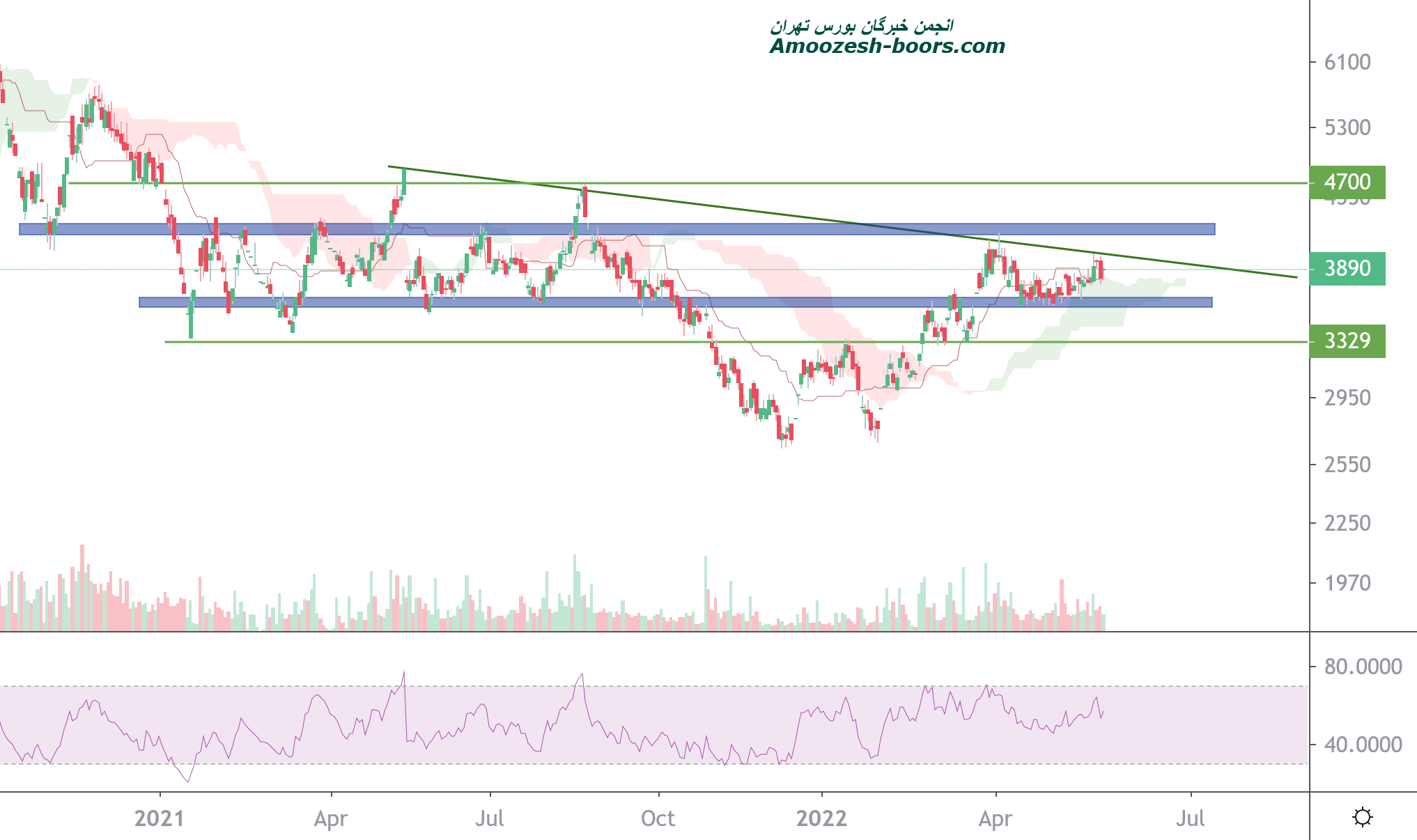 قیمت در حال اصلاح زمانی و در جا زدن در محدوده حمایتی و مقاومتی میباشد در صورتی که قیمت موفق به شکست پر قدرت مقاومت خط داینامیک نزولی در محدوده قیمتی عدد رند و روانی 4000 ریال شود حرکت قیمت تا مقاومت استاتیک 4700 ریال دور از ذهن نخواهد بود و همچنین در صورت از دست رفتن حمایت استاتیک در محدوده قیمتی 3600 ریال حمایت بعدی سهم 3300 ریال در نظر گرفته خواهد شد.