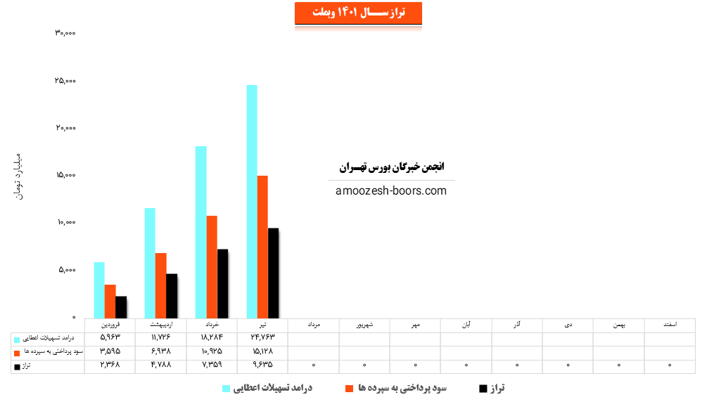 نماد وبملت (بانک ملت) با نماد وبملت در تیر ماه سال 1401 حدود مبلغ 24763 میلیارد تومان از محل تسهیلات اعطایی به افراد درآمد داشته که این میزان در مقایسه با ماه گذشته 35% افزایش پیدا کرده است.