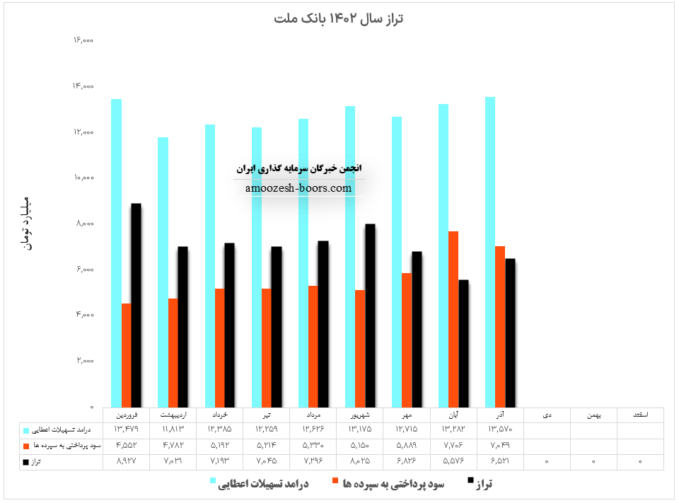 بانک ملت ( وبملت ) در بهمن ماه 1402 کاهش جزئی تراز را به همراه داشت، به طوری که هزینه ها مشابه ماه گذشته و درآمد 3% از ماه قبل کمتر گزارش شده بود، با این حال تراز عملیاتی وبملت در بهمن ماه سال 1402 مثبت 66% گزارش گردید.