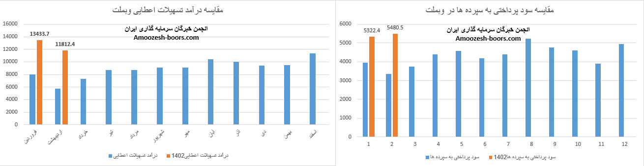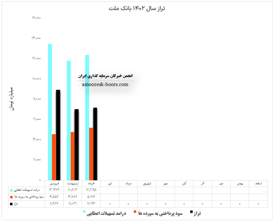 نماد وبملت طی دوره فعالیت تیر ماه سال 1402 مبلغ 12259.2 میلیارد تومان را شناسایی نموده است که از محل تسهیلات اعطایی، سپرده گذاری و کارمزد شناسایی گردیده است، همچنین هزینه های پرداختی بانک ملت طی این دوره از محل سود سپرده ها، هزینه های کارمزد و هزینه های مالی برابر با 6449.9 میلیارد تومان گزارش شده است، تراز عملیاتی سهم وبملت طی دوره 1 ماهه 90% گزارش گردیده است، همچنین عملکرد تجمیعی بانک ملت تراز مثبت 116 درصدی طی 4 ماه را نشان میدهد.