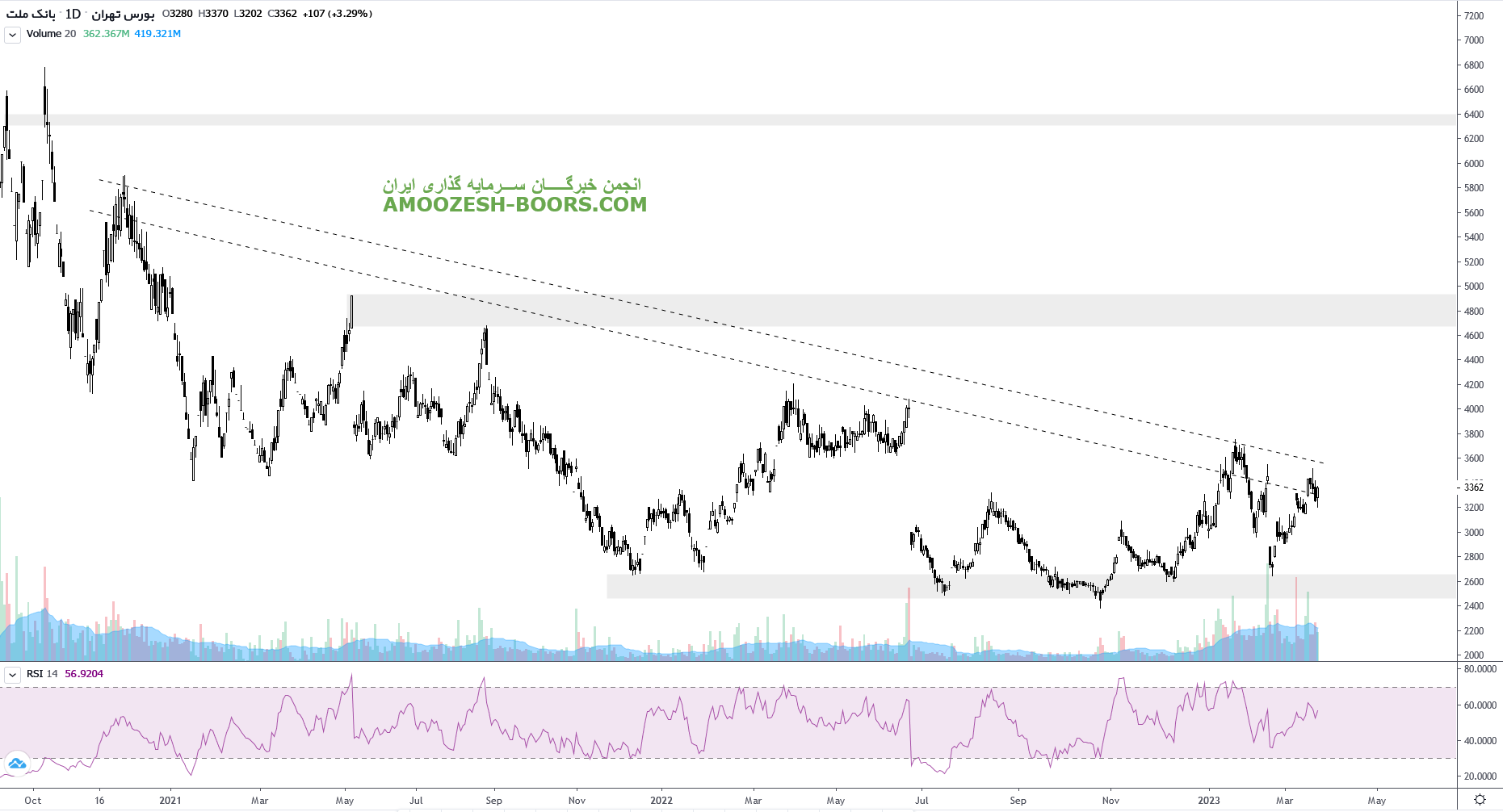 قیمت سهام بانک ملت پس از کف سازی در ناحیه ۲۶۰ تومان اکنون پتانسیل رشد تا ناحیه مقاومتی ۴۸۰ تومان را دارد اما در صورتی که بتواند از خط روند نزولی خود عبور کند. در صورت عدم توانایی قیمت از عبور از خط روند نزولی قیمت می تواند بار دیگر تا کف حمایتی ۲۶۰ تومان اصلاح داشته باشد.