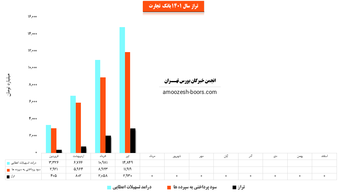 نماد وتجارت (بانک تجارت) در دوره یک ماهه منتهی به 31 شهریور ماه 1401، مبلغ 4,734.7 میلیارد تومان از محل سود تسهیلات خود درآمد داشته و مبلغ 3,365.6 میلیارد تومان سود سپرده پرداخت نموده است.