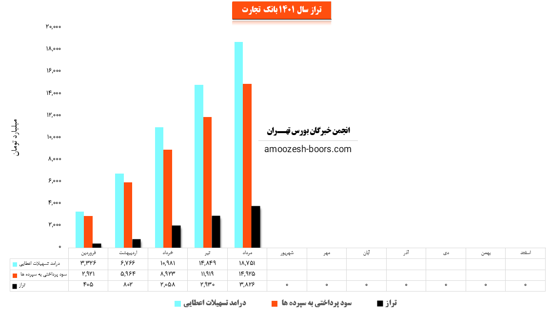 نماد وتجارت (بانک تجارت) در مرداد ماه سال 1401 حدود مبلغ 18751 میلیارد تومان از محل تسهیلات اعطایی به افراد درآمد داشته که این میزان در مقایسه با ماه گذشته 26% افزایش پیدا کرده است.