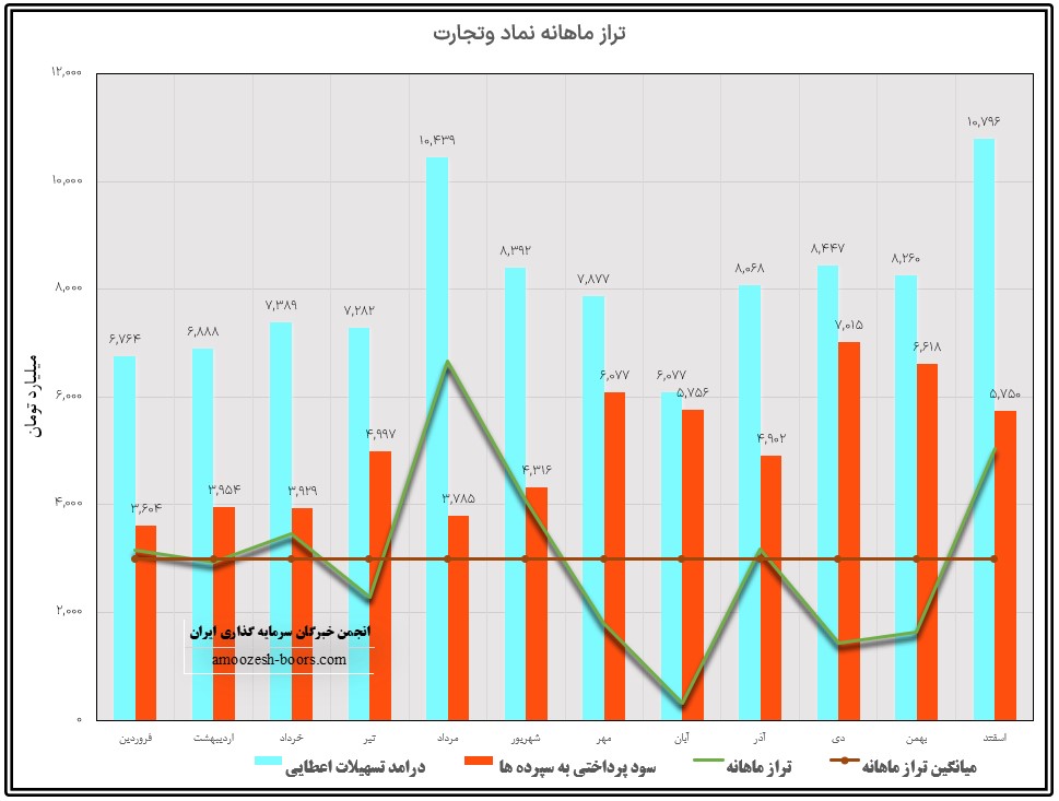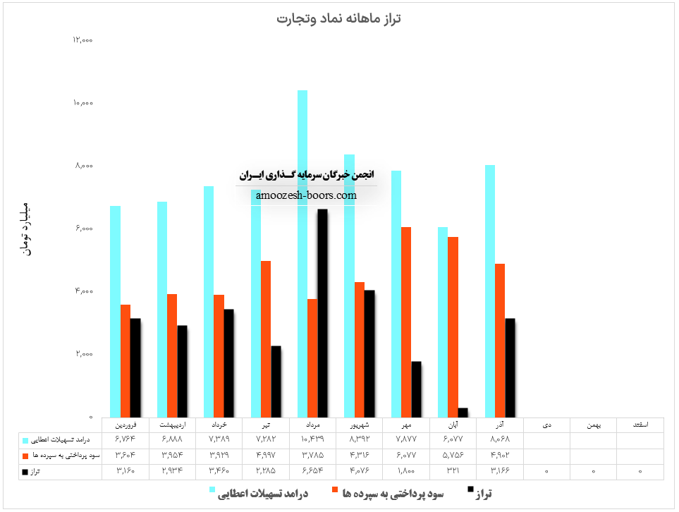 عملکرد ماهانه سهم وتجارت نشان میدهد که درامد تسهیلات اعطایی افزایش 5 درصدی و سود پرداختی به سپرده ها افزایش 11 درصدی نسبت به ماه گذشته داشته است و در نتیجه تراز بانک تجارت در دی ماه مثبت 20% گزارش شده است.