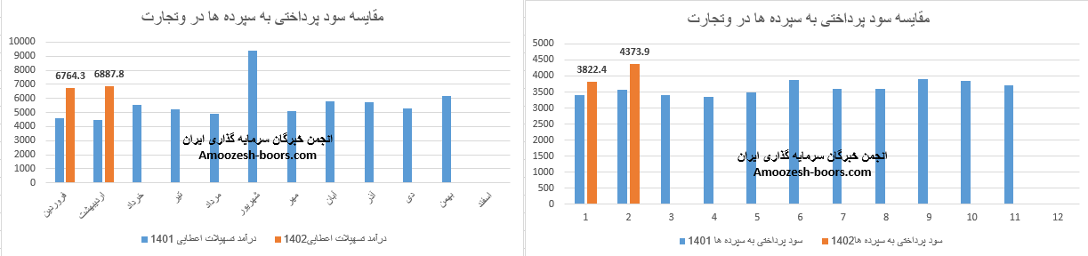 نماد وتجارت (بانک تجارت) در خرداد ماه سال 1402 حدود مبلغ 7389 میلیارد تومان درآمد داشته که این میزان در مقایسه با ماه گذشته 7% افزایش پیدا کرده است. همچنین سهم وتجارت در خرداد ماه مبلغ 3929 میلیارد تومان به سپردههای خود سود پرداخت کرده که این میزان با کاهش 1 درصدی نسبت به ماه گذشته روبرو شده است.