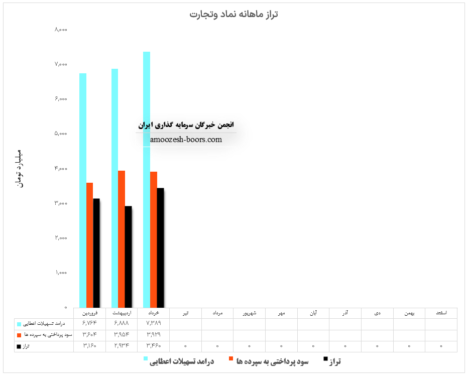 درآمد نماد وتجارت طی عملکرد 1 ماهه تیر ماه سال 1402 برابر با 7281.5 میلیارد تومان گزارش شده است، همچنین هزینه های پرداختی بانک تجارت طی دوره یک ماهه برابر با 4996.9 میلیارد تومان بوده است و طی این دوره تراز مثبت 46% را ثبت نموده است، تراز تجمیعی بانک تجارت طی دوره 4 ماهه 57% مثبت میباشد.