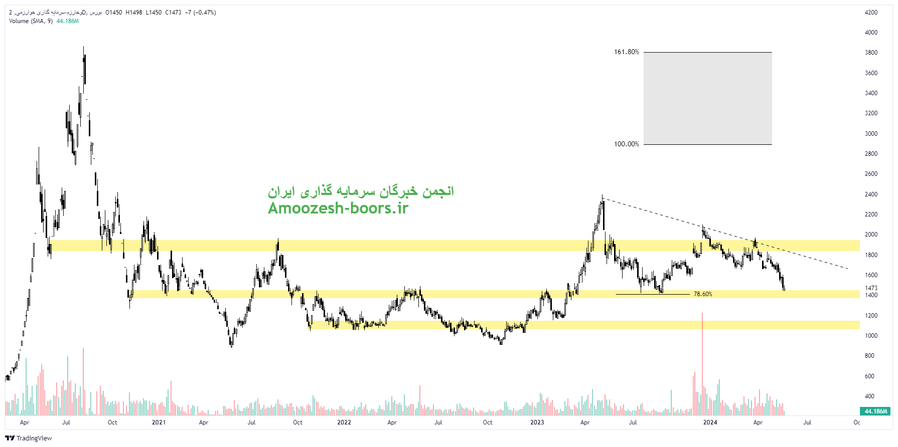 سهم و خوارزم بر روی محدوده حمایتی ۱۴۰۰ ریال قرار گرفته است لذا در صورت ایجاد تقاضا از این ناحیه و همچنین عبور از ناحیه مقاومتی ۱۹۰۰ ریال سهم مورد تقاضا قرار گرفته، و احتمال دارد تا مقاومتهای نواحی ۲۴۰۰ ريال، ۲۹۰۰ ريال و ۳۸۰۰ روند صعودی خود را ادامه دهد. اما در صورت از دست رفتن حمایت ناحیه ۱۴۰۰ ریال نزدیکترین حمایت به سهم و خوارزم ناحیه ۱۰۰۰ ریال در نظر گرفته خواهد شد.