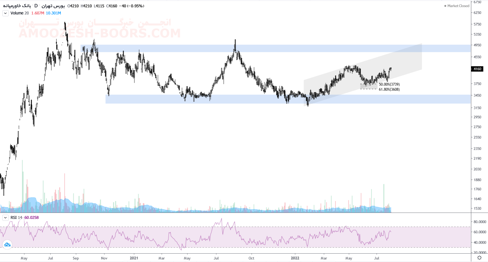 سهم وخاور (بانک خاورمیانه) در حال حاضر حمایت 3650 ریال را دارا میباشد، در صورت تثبیت حرکت قیمت سهم وخاور تا 4000 ریال دور از ذهن نخواهد بود، همچنین در صورت از دست رفتن این حمایت، حمایت بعدی 3300 ریال خواهد بود.