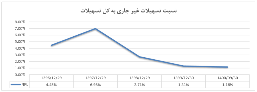 هرچقدر مطالبات غیرجاری به کل مطالبات کمتر باشد، وضعیت بانک بهتر است و مشتریان معوقات کمتری دارند و عملیات و نظارت بانکی به نحو مطلوب تری در جریان میباشد که این کاهش 1/16 ماهه ابتدایی سال جاری برابر با 9 است و ارزش بانک در حال افزایش میباشد. همان گونه که در جدول زیر قابل مشاهده است این نسبت در ناشی از تسویه مطالبات غیر جاری در سال جاری بوده است.