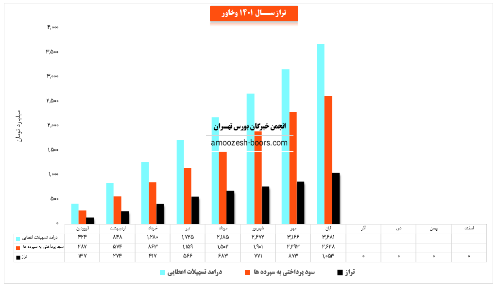 وخاور (بانک خاورمیانه) در آبان ماه سال 1401 حدود مبلغ 3681 میلیارد تومان از محل تسهیلات اعطایی به افراد درآمد داشته که این میزان در مقایسه با ماه گذشته 16% افزایش پیدا کرده است.