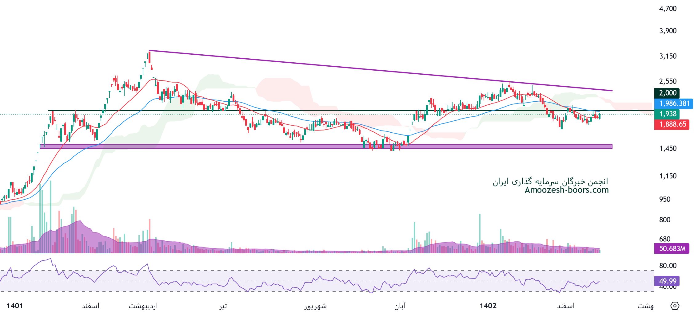 مقاومت نماد وساخت از ناحیه پر تراکم 2000 ریال تشکیل شده است و با توجه به شرایط بازار شکست مقاومت و رسیدن به تارگت 2400 ریال خوش بینانه میباشد.