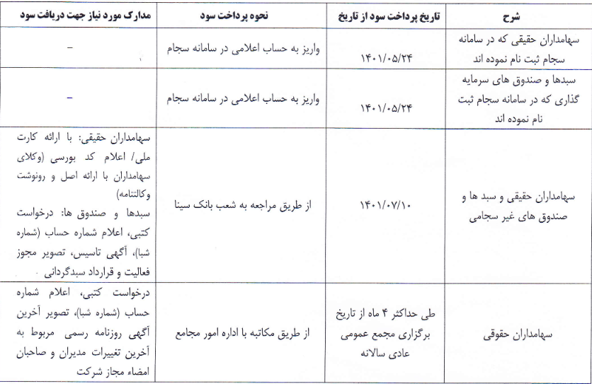 برنامه زمانبندی پرداخت سود سهام سهامداران وسینا که در تاریخ مجمع عمومی عادی سالانه (نوبت دوم ) مورخ ۱۴۰۱/۰۵/۱۳ سهامدار سهم وسينا بوده اند به شرح جدول ذیل اعلام می گردد: