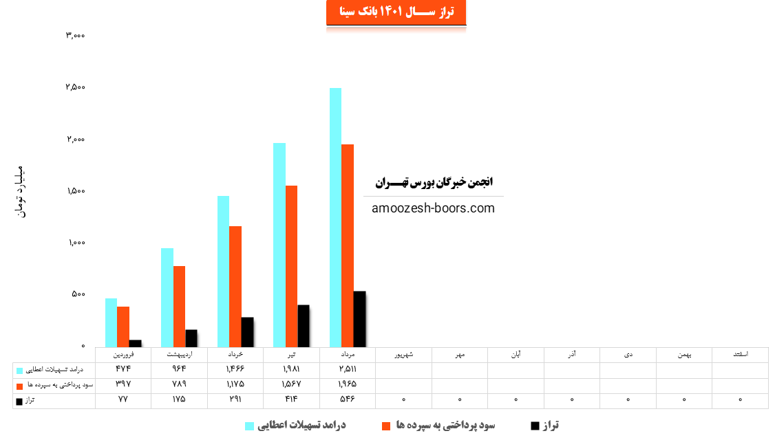 سهم وسینا (بانك سينا) در تیر ماه سال 1401 حدود مبلغ 1981 میلیارد تومان از محل تسهیلات اعطایی به افراد درآمد داشته که این میزان در مقایسه با ماه گذشته 35% افزایش پیدا کرده است.