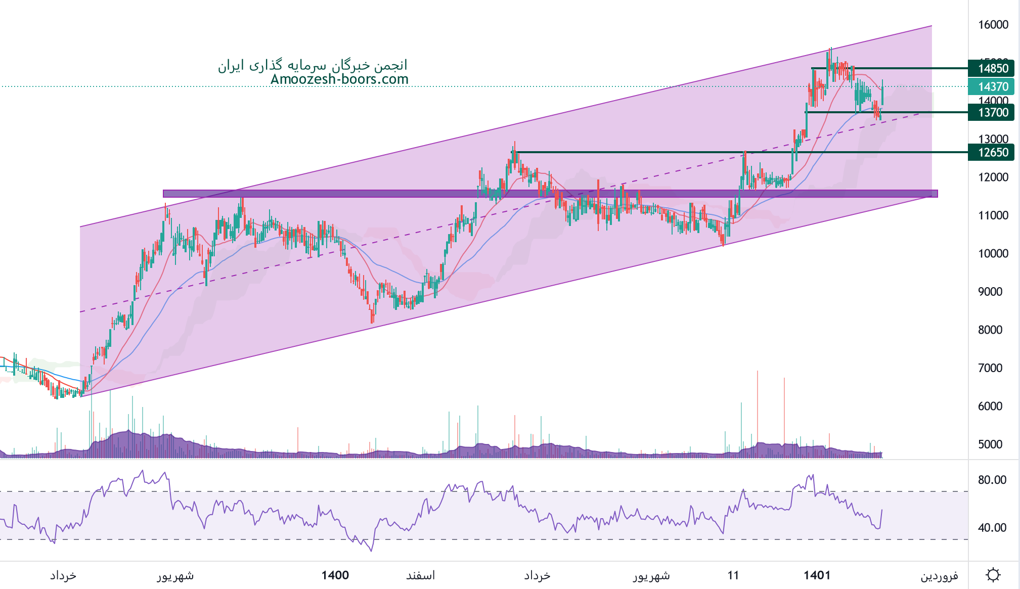 نماد وصندوق مابین محدوده حمایتی 13700 ریال و 14850 ریال قرار دارد، با توجه به اخرین کندل صعودی، احتمال عبور از محدوده مقاومتی زیاد میباشد، در این صورت حرکت قیمت سهم وصندوق تا 16000 ریال محتمل میباشد، همچنین در صورت اصلاح و از دست رفتن محدوده حمایتی ذکر شده، حمایت بعدی 12650 ریال ارزیابی میگردد.