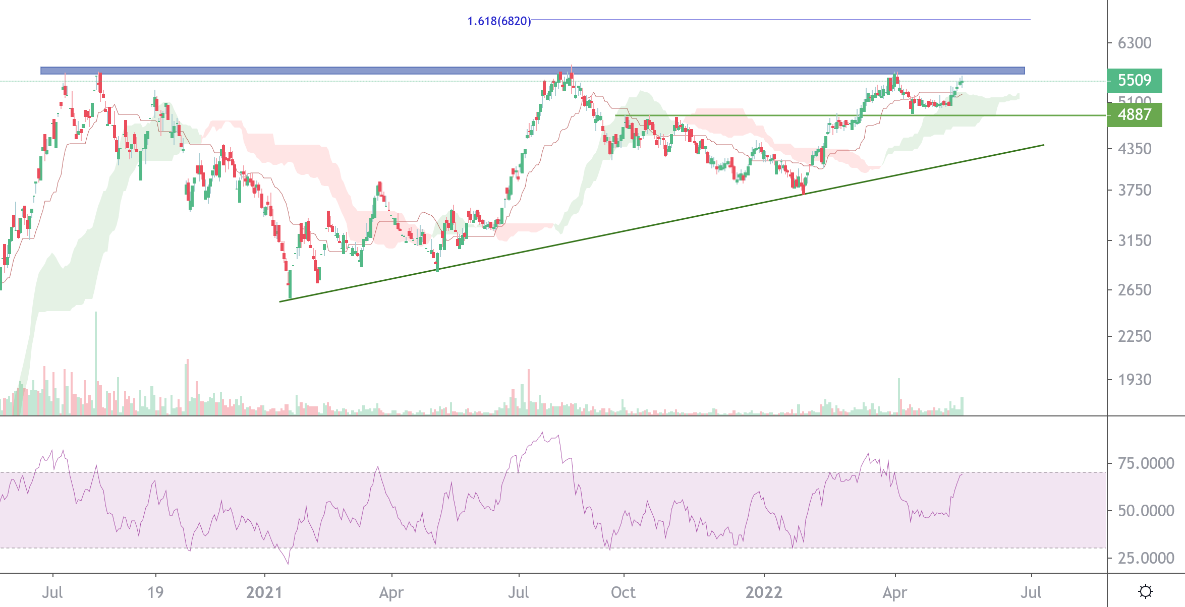 قیمت در حال حاضر درگیر محدوده مقاومتی استاتیک 5550 میباشد در صورت ادامه دار شدن حجم تقاضا و شکست پر قدرت این سطح مقاومتی حرکت قیمت تا محدوده 6800 ریال دور از ذهن نخواهد بود و در همچنین در صورت اصلاح اولین حمایت سهم 5000 ریال در نظر گرفته خواهد شد که در این صورت حد ضرر سهامدارن فعال خواهد شد.