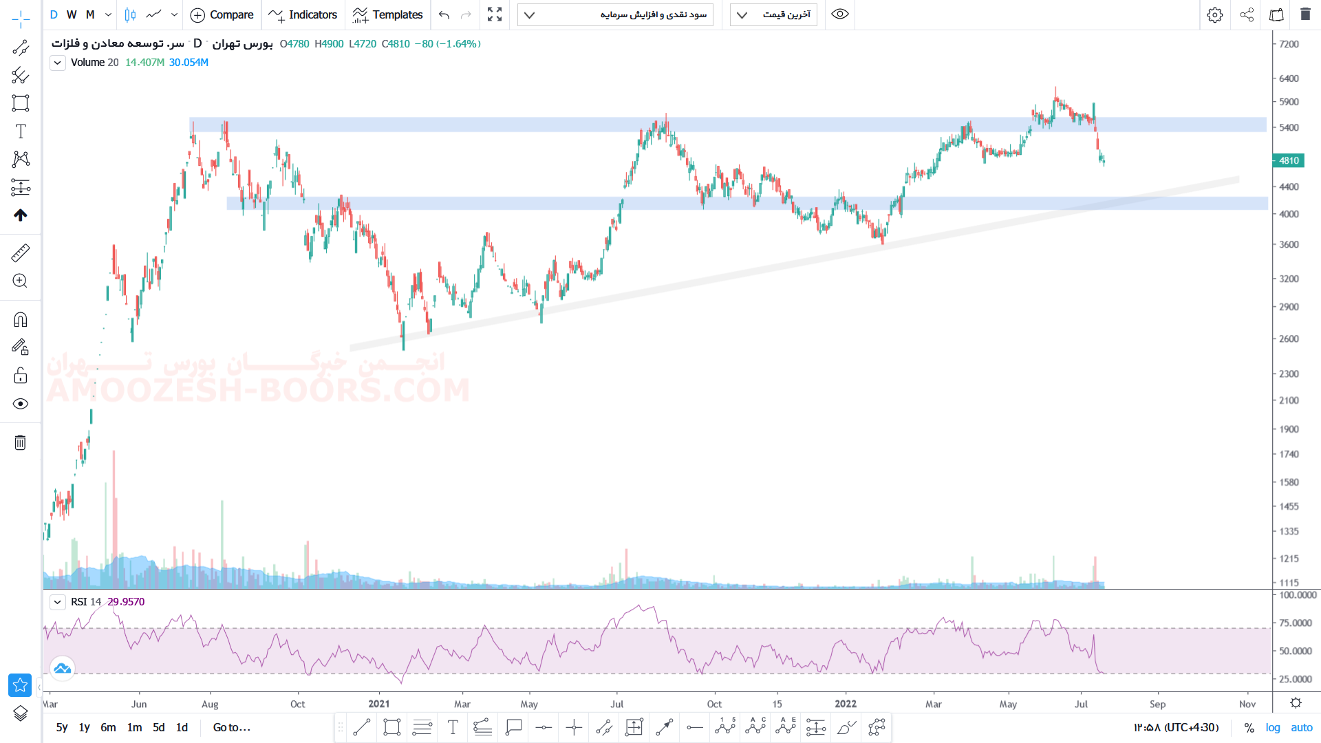 قیمت سهم ومعادن پس از تلاش برای شکست سقف تاریخی ناحیه 530 تومان و ناتوانی در شکست آن مجدد به زیر ناحیه مقاومتی بازگشته و اکنون نیز ناحیه حمایتی مهم خط روند صعودی و ناحیه ۴۲۵ تومان را سر راه خود دارد که می تواند سد راه قیمت از ریزش بیشتر شود. در صورت حمایت از ناحیه حمایتی ۴۲۰ تومان، قیمت نماد ومعادن میتواند مجدداً مقاومت سرسخت ۵۳۰ تومان را تست کند.
