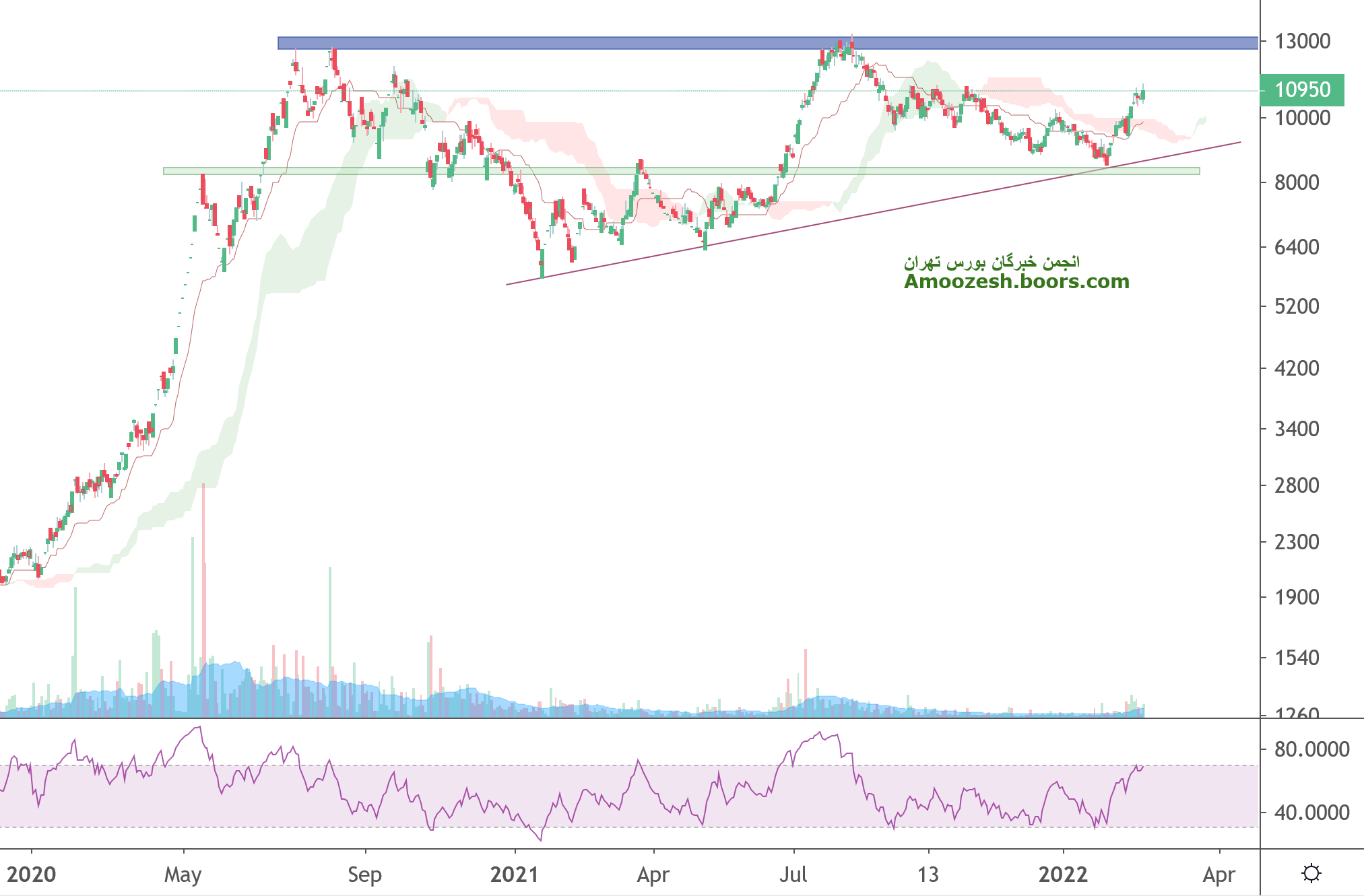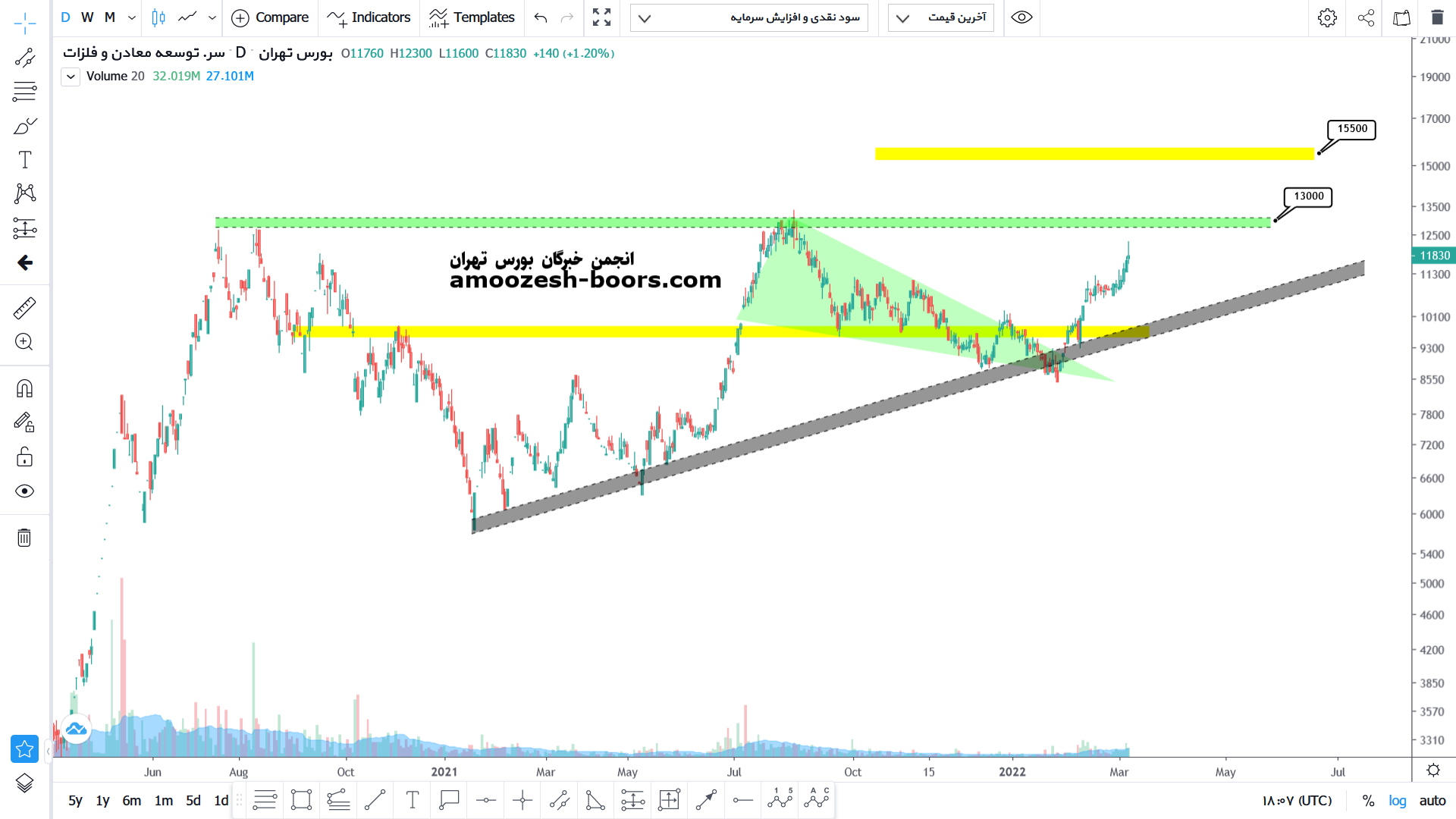 پس از شکسته شدن محدوده مقاومتی 1000 تومان رشد قیمت ادامه پیدا کرده و اکنون به محدوده مقاومتی 1300 تومان رسیده است که در صورت بروز واکنش منفی به این محدوده مجدداً قیمت تا محدوده 1000 تومان نزول خواهد کرد اما در صورت شکست این محدوده مقاومتی مهم میتواند رشد خود را تا محدوده مقاومتی ۱۵۵۰ تومان ادامه دهد.