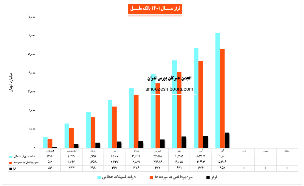 سهم وملل (موسسه اعتباری ملل) در آذر ماه سال 1401 بصورت تجمیعی حدود مبلغ 6161 میلیارد تومان از محل تسهیلات اعطایی به افراد درآمد داشته که این میزان در مقایسه با ماه گذشته 15% افزایش پیدا کرده است.