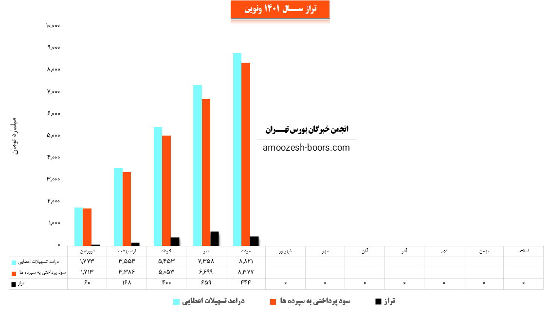 همچنین نماد ونوین در مرداد ماه مبلغ 8377 میلیارد تومان به سپردههای خود سود پرداخت کرده که این میزان با افزایش 25 درصدی نسبت به ماه گذشته روبرو شده و لذا با توجه به آمار مذکور تراز ونوین با 33% کاهش نسبت به ماه گذشته به 444 میلیارد تومان رسیده است.