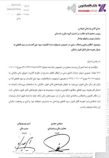 ونوین طی افشاییه زیر در خصوص شموليت مابهالتفاوت سود علي الحساب و سود قطعي که در پايان هر سال مالي تعيين ميشود اعلام نموداثري بر وضعيت مالياتي اين بانک نخواهد داشت .