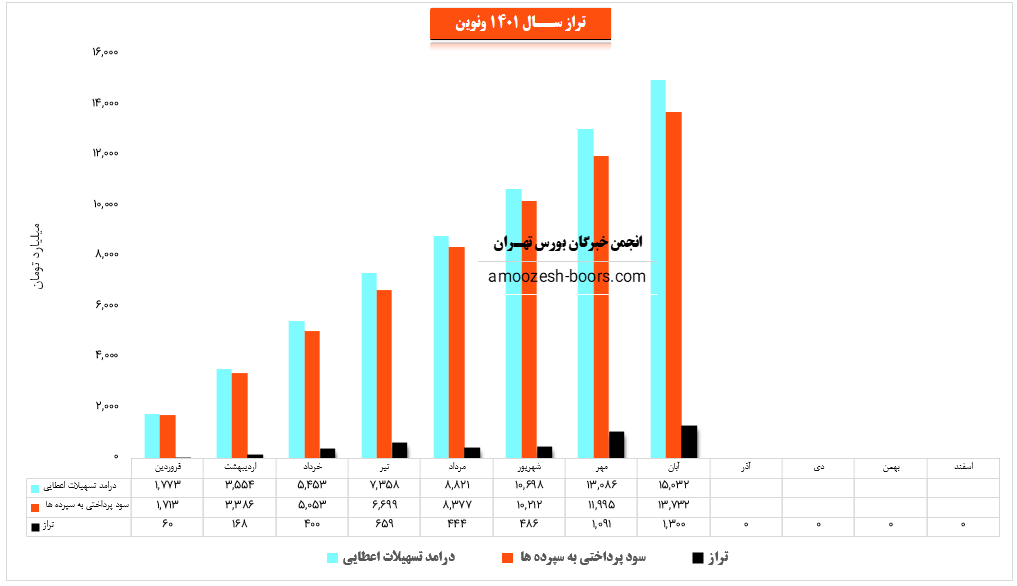 همچنین این بانک در آبان ماه مبلغ 13732 میلیارد تومان به سپردههای خود سود پرداخت کرده که این میزان با افزایش 14 درصدی نسبت به ماه گذشته روبرو شده و لذا با توجه به آمار مذکور تراز این شرکت با 19% افزایش نسبت به ماه گذشته به 1300 میلیارد تومان رسیده است.