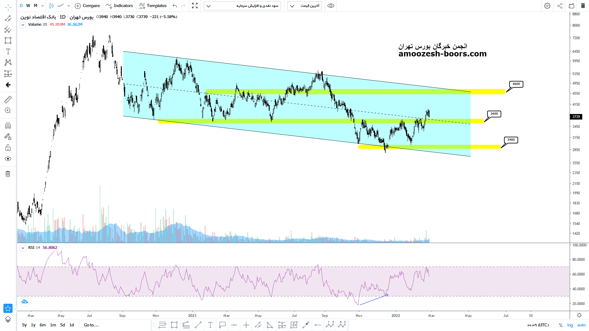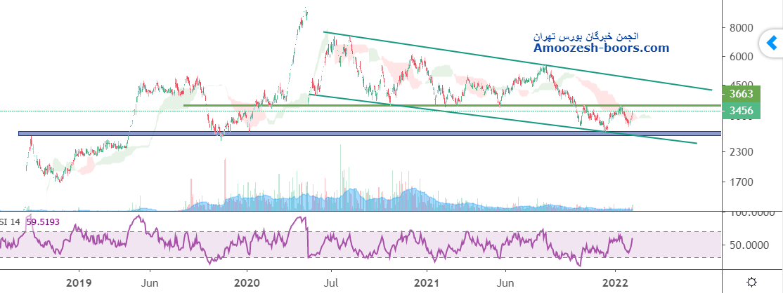 3600 ریال مقاومت سهم تا تارگت سقف کانال محدوده 4500 ریال محسوب میگردد همچنین در صورت ایجاد نشانه برگشت روی این سطح ، اصلاح قیمتی تا حمایت 2800 (دره قیمتی قبلی ) ادامه خواهد داشت.