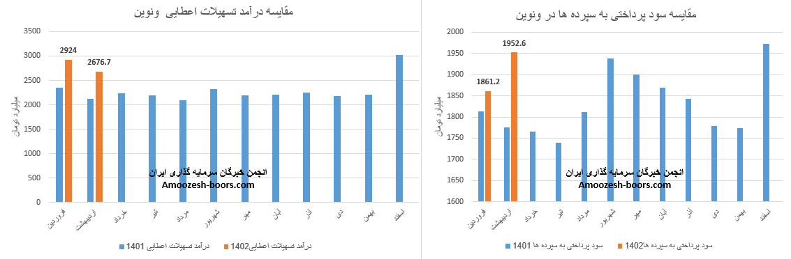 درآمد محقق شده بانک تقتصاد نوین در فروردین ماه برابر 2924 میلیارد تومان به ثبت رسیده که عمدتا از طریق تسهیلات اعطائی، کارمزد و اوراق بدهی تامین شده است، همچنین هزینه های پرداختی سهم ونوین در فروردین ماه بابت سود پرداختی سپرده ها و هزینه های مالی برابر با 1861.2 میلیارد تومان بوده است، در نتیجه تراز سهم ونوین در فروردین ماه مثبت 57% میباشد.