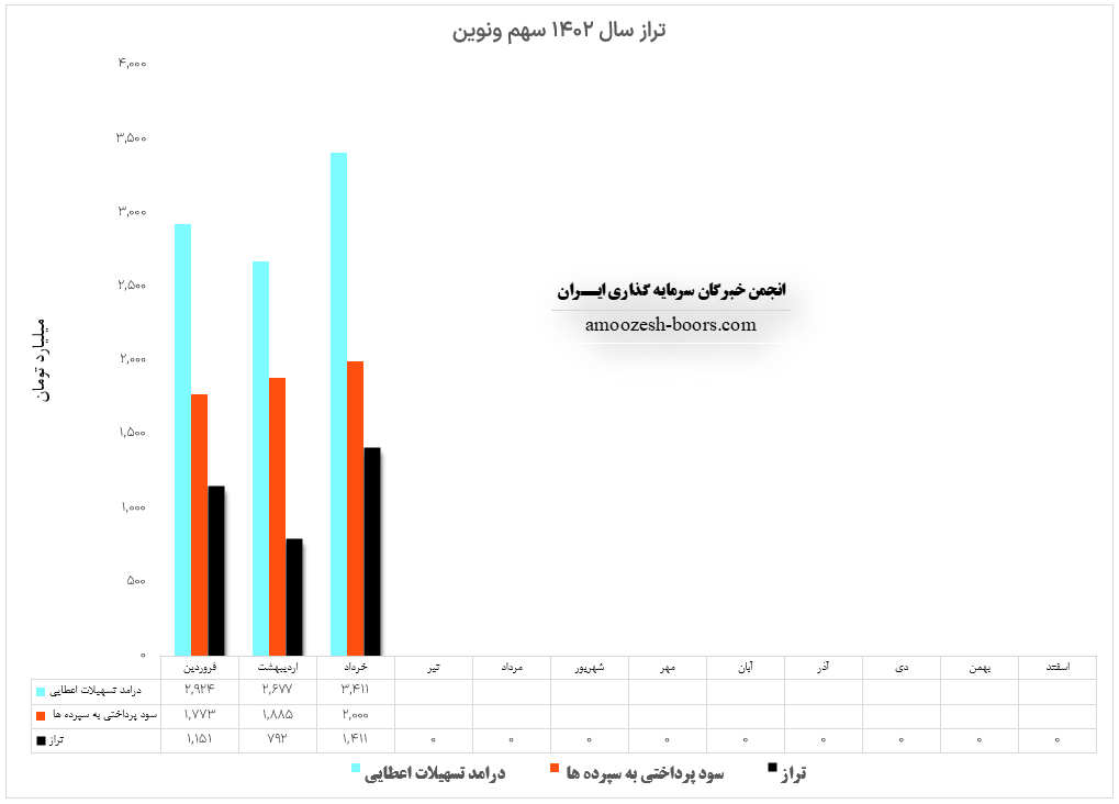 با توجه به آمار مذکور تراز نماد ونوین با رشد ۷۸ درصدی به بیش از 1410 میلیارد تومان رسید. مجموع تراز فصل بهار سهم ونوین به بیش از 5600 میلیارد تومان رسیده است.