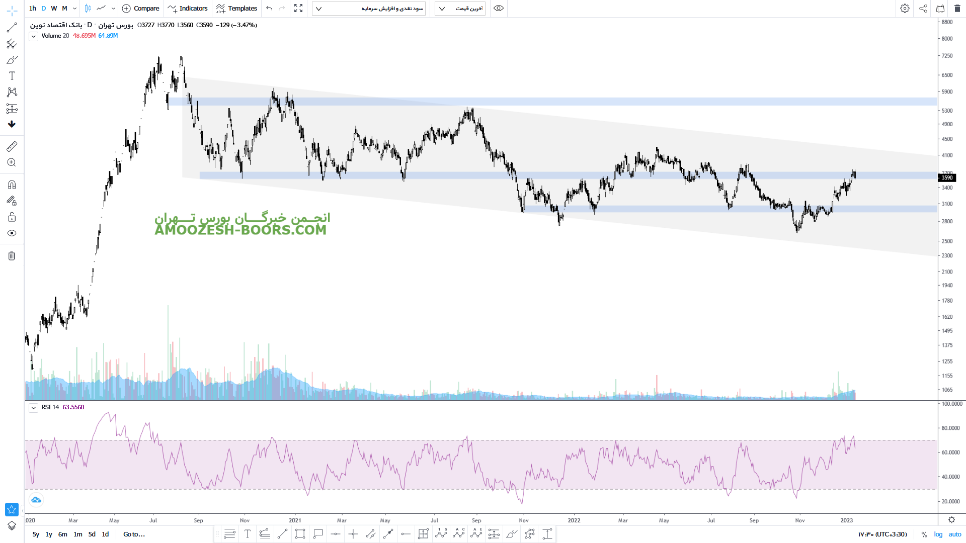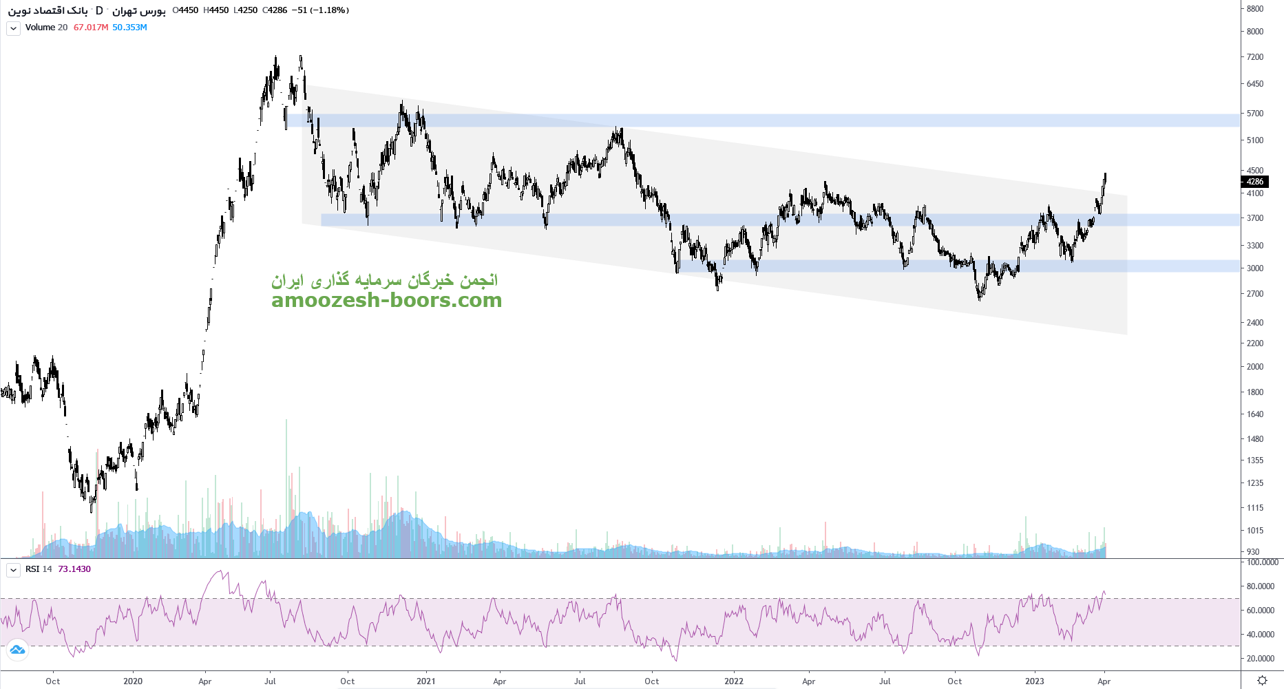 قیمت سهم ونوین بر روی مقاومت مهم ناحیه ۳۶۰ تومان قرار گرفته است که میتواند با شکست آن رشد خود را تا ناحیه مقاومتی سقف کانال نزولی ادامه دهد در صورت بروز واکنش منفی حمایت بعدی سهم ونوین ناحیه ۳۰۰ تومان در نظر گرفته شده است.