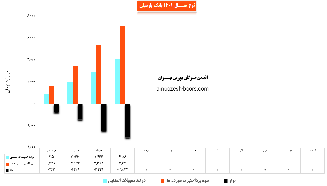 سهم وپارس (بانک پارسیان) در دوره یک ماهه منتهی به 30 مهر ماه 1401، مبلغ 1,149.4 میلیارد تومان از محل سود تسهیلات خود درآمد داشته 8 درصد کمتر از شهریور ماه است. و مبلغ 1,967.3 میلیارد تومان سود سپرده پرداخت نموده است که این رقم مشابه ماه قبل گزارش شده است . وپارس در این دوره تراز منفی 817.9 میلیارد تومان (42-%) را ثبت کرده است. تراز سهم وپارس در این دوره نسبت به ماه قبل 14% کاهش و نسبت به میانگین ماه های قبل 7% کاهش داشته است. بانک نسبت به دوره 1 ماهه مشابه سال قبل 33% کاهش تراز داشته است.