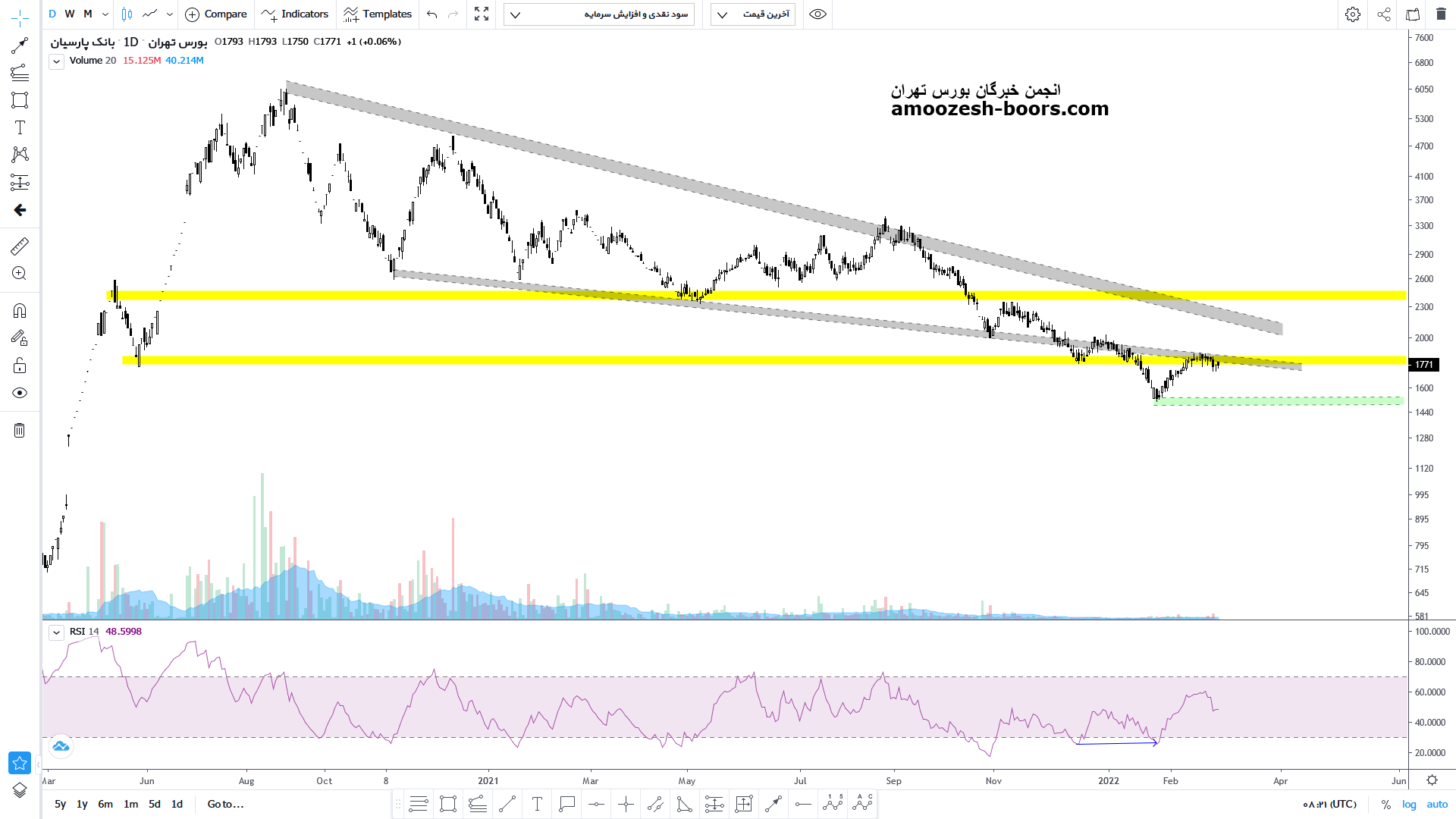 وپارس در حال حاضر حمایت 1700 ریال و مقاومت میدلاین کانال را دارا میباشد،در صورت عبور از مقاومت تارگت سهم 2400 ریال در نظر گرفته خواهد شد،همچنین در صورت از دست رفتن حمایت، حمایت بعدی 1400 ریال خواهد بود و حد ضرر فعال میگردد.