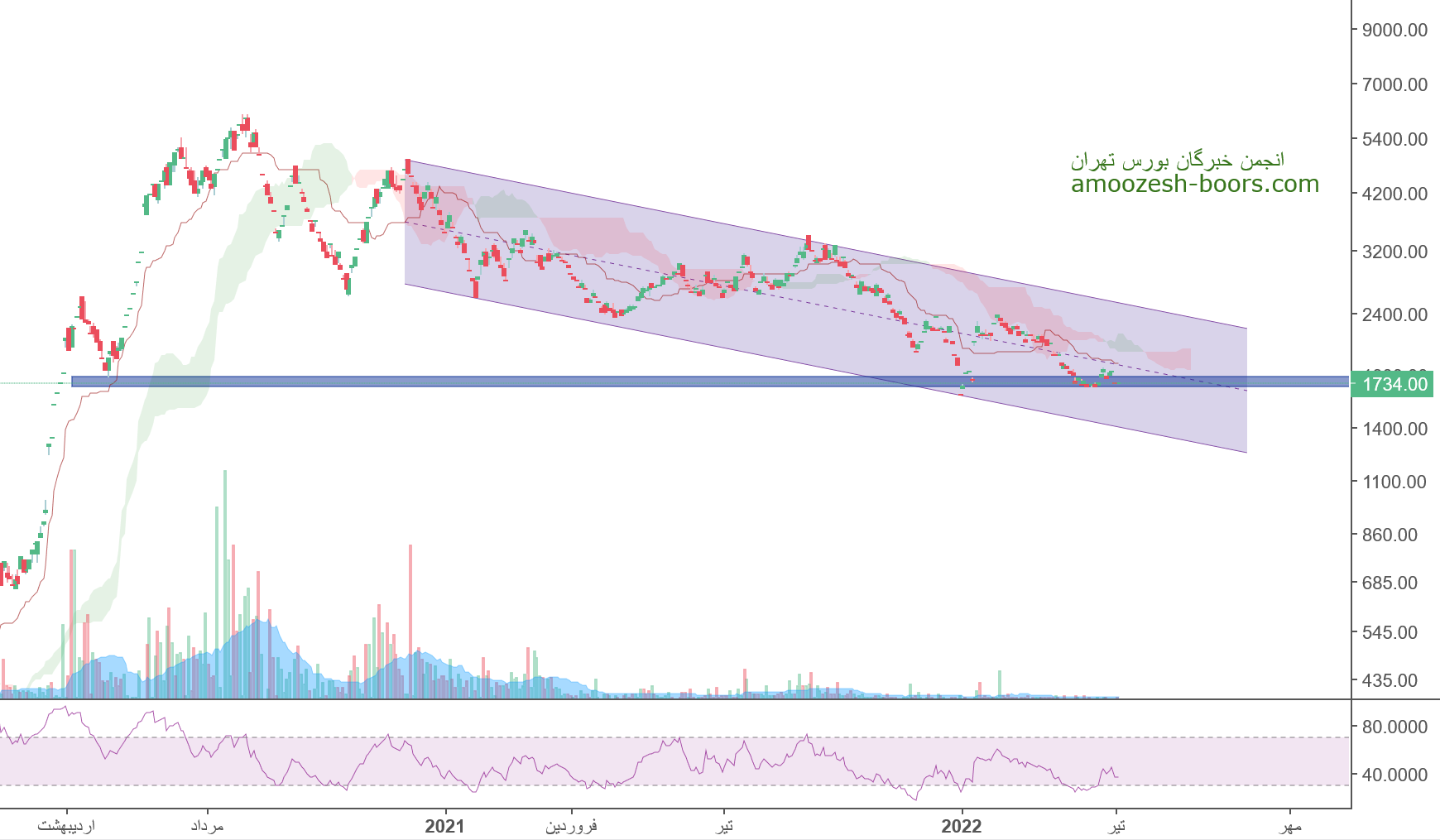 قیمت پس از شکست حمایت مهم محدوده ۱۸۰ تومان ریزش خود را تا محدوده حمایتی ۱۵۰ تومان ادامه داده و پس از رشدی اکنون با مقاومت محدوده ۱۸۰ تومان درگیر است در صورت توانایی قیمت در شکست این محدوده مقاومتی مهم هم می تواند رشد خود را تا خط روند نزولی و سپس در صورت شکست آن تا حدود ۲۵۰ تومان نیز ادامه دهد اما در صورت برگشت و عدم توانایی در شکست این محدوده مقاومتی مجدداً قیمت محدوده ۱۵۰ تومان را تست خواهد کرد