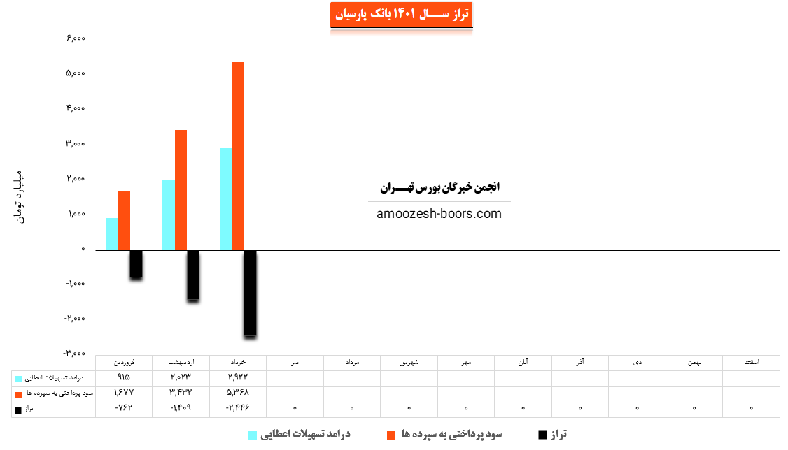 سهم وپارس (بانک پارسیان) در خرداد ماه سال 1401 حدود مبلغ 2922 میلیارد تومان از محل تسهیلات اعطایی به افراد درآمد داشته که این میزان در مقایسه با ماه گذشته 44% افزایش پیدا کرده است.