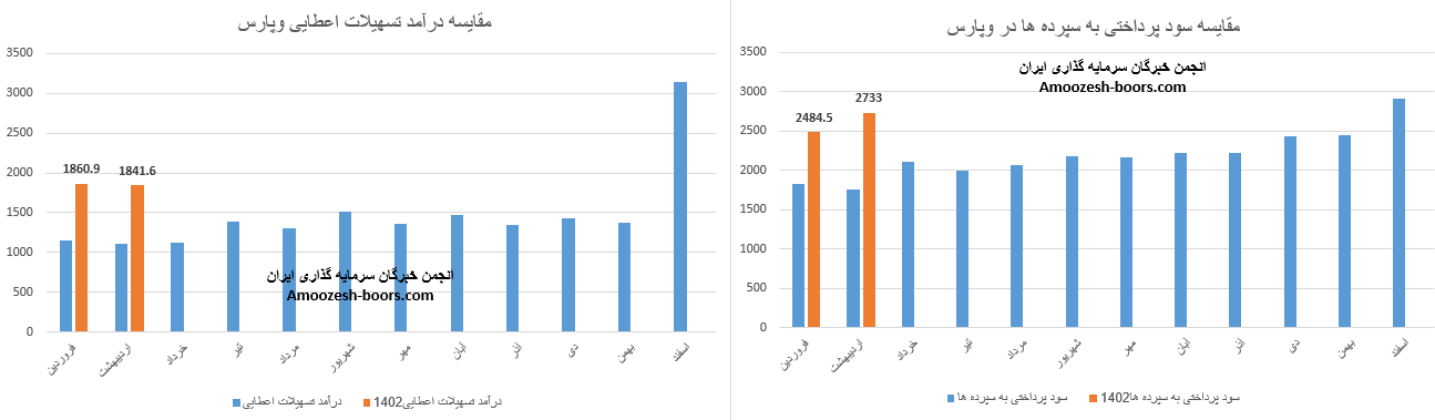 درآمد نماد وپارس در عملکرد ماهانه اردیبهشت ماه سال 1402 برابر با 1841.6 میلیارد تومان گزارش شده و میزان پرداختی های بانک پارسیان برابر با 2733 میلیارد تومان بوده است، تراز سهم وپارس برابر با منفی 33% میباشد که نشان از افزایش ریسک و تضعیف فاکتور های بنیادی این بانک دارد،