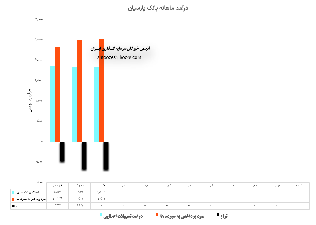 درآمد عملیاتی بانک پارسیان در فروردین ماه سال 1402 1860.9 میلیارد تومان میباشد و هزینه های پرداختی وپارس در این ماه برابر با 2484.5 میلیارد تومان است، با توجه به افزایش پرداختی به نسبت درآمد حاصله بانک پارسیان شاهد تراز منفی 25% نماد وپارس در فروردین ماه هستیم.