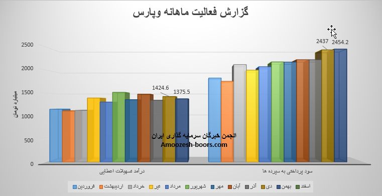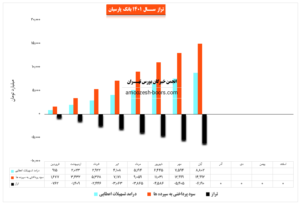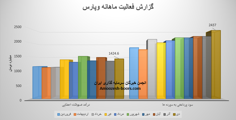سهم وپارس در آذر ماه سال 1401 مبلغ ۱۱۲۸ میلیارد تومان از محل تسهیلات اعطایی و حدود ۱۶۳ میلیارد تومان از محل کارمزدها درآمد کسب کرده است. همچنین سهم وپارس در آذرماه حدود مبلغ ۲۰۳۷ میلیارد تومان به سپرده های خود سود پرداخت کرده که طبق روال های گذشته منجر به ثبت تراز منفی ۷۴۶میلیارد تومانی سهم وپارس شده است.